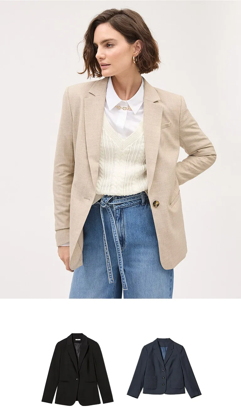 Now, the classic blazer. Throw it on over jeans or a dress to elevate your look instantly. The blazer is there to help complete your look and pull everything together with a nice touch of polish.