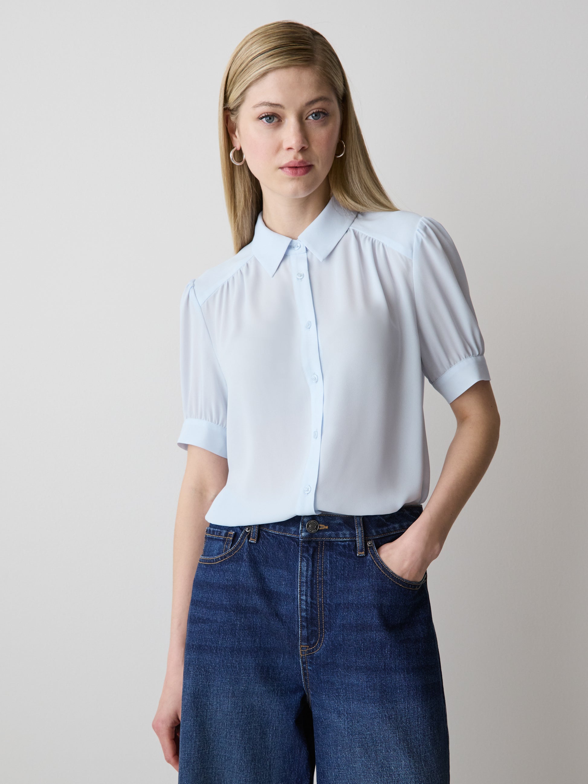 A definite essential to add to your wardrobe, wear this buttoned-down blouse made of silky crepe and designed with short puffy sleeves with a pair of jeans for a trendy everyday look.