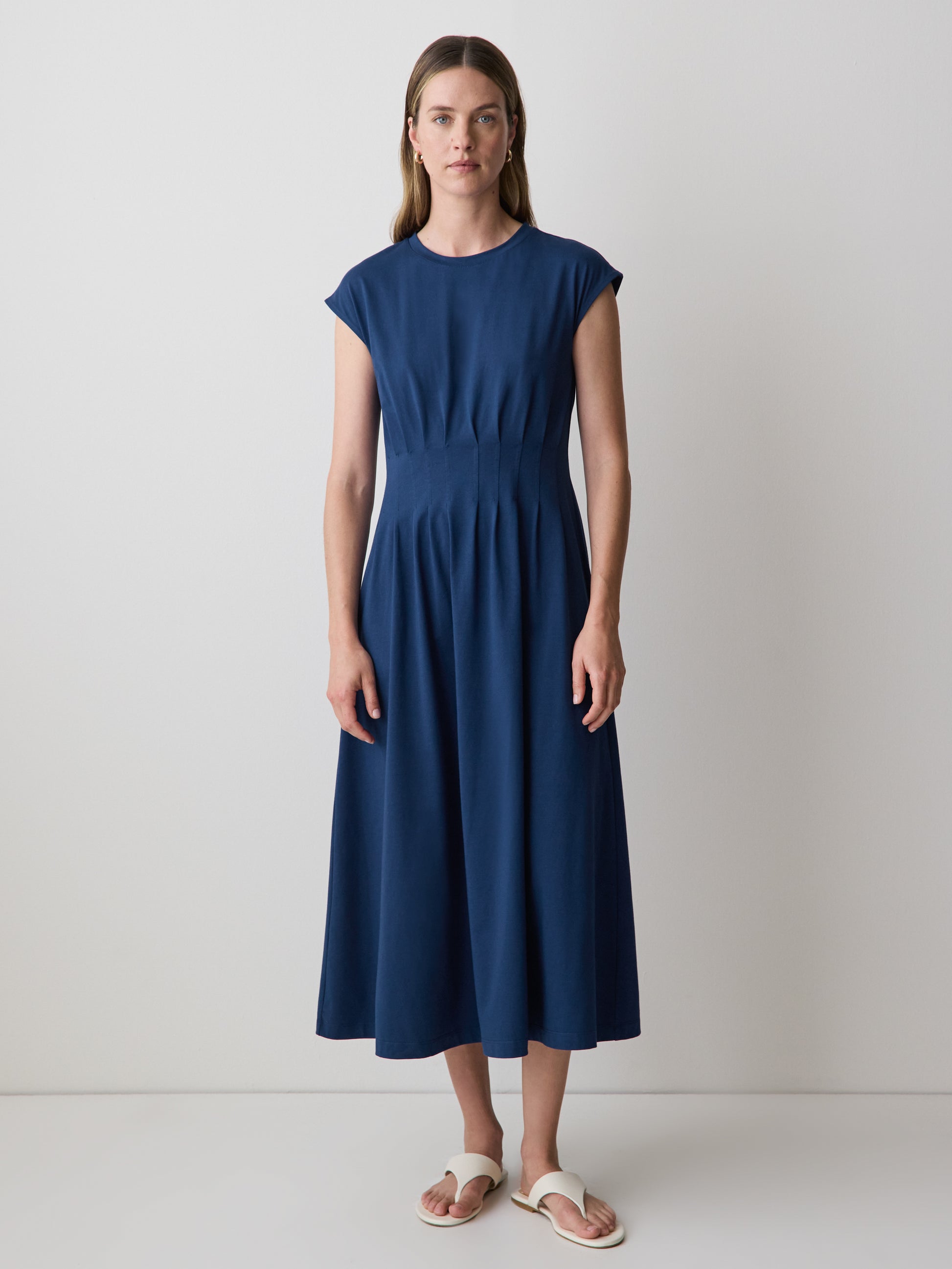 This stylish midi dress featuring extended sleeves, a clean crew neck and soft pintucks, creates a refined silhouette perfect for any occasion.
