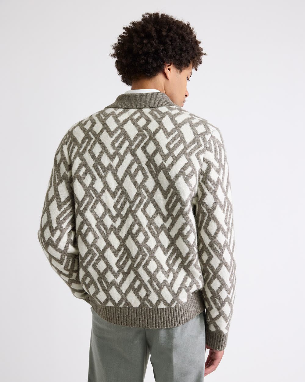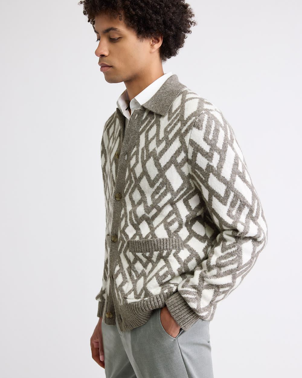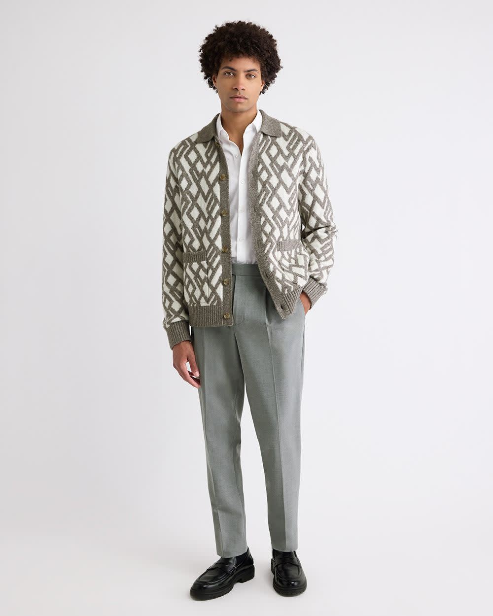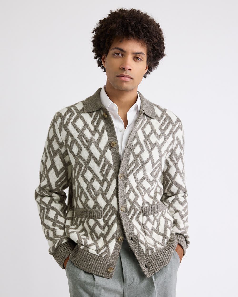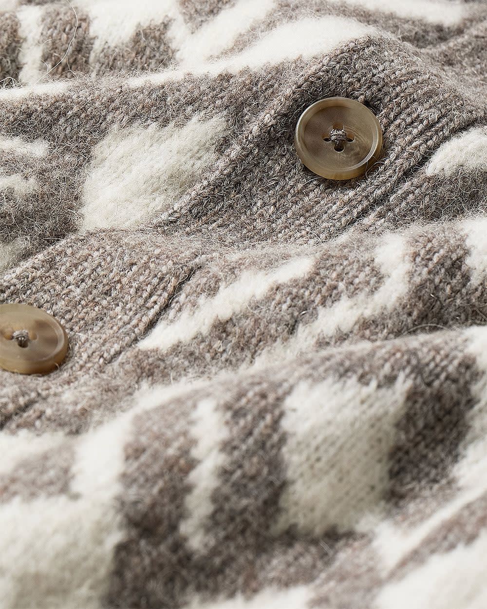 Crafted from a luxurious alpaca blend, elevate your cold-weather wardrobe with this unique argyle cardigan. Soft, lightweight, and naturally insulating, alpaca fibers offer exceptional warmth without the bulk. This versatile piece effortlessly pairs with any outfit.