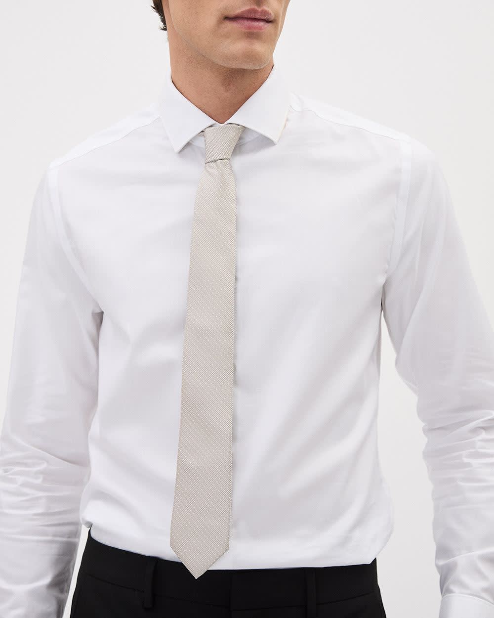 Elevate your look with this regular beige silk tie featuring a dotted pattern.