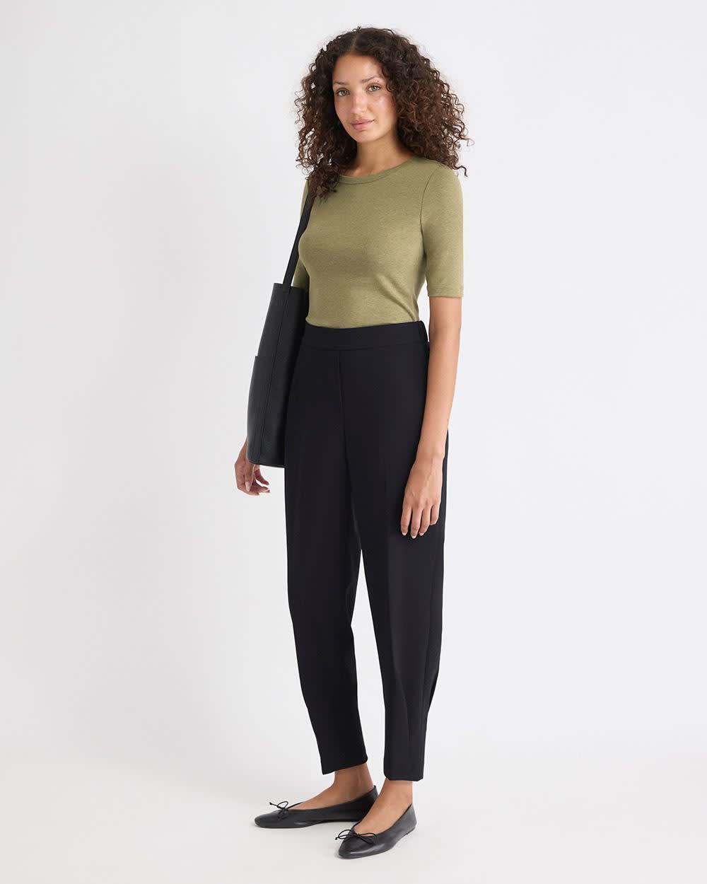 We love the unique style of these mid-rise jogger pants featuring a tapered leg. The flowy fabric is light and comfortable, perfect for everyday wear.