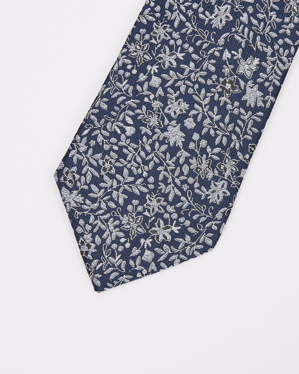 Upgrade your suit attire with this regular tie, crafted from luxurious navy silk and adorned with an exquisite foliage motif.