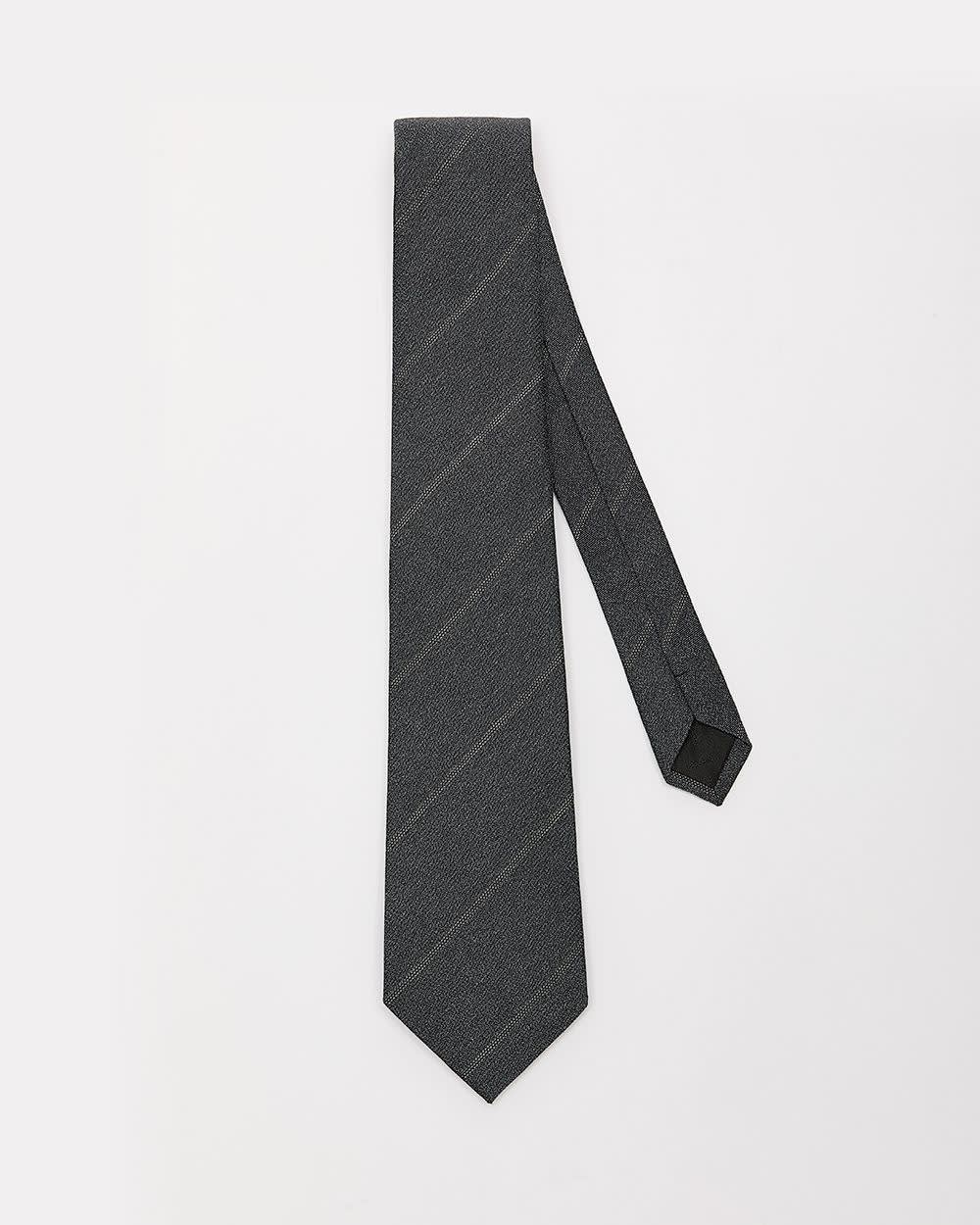 Elevate your look with this wide charcoal silk tie featuring a striped pattern.
