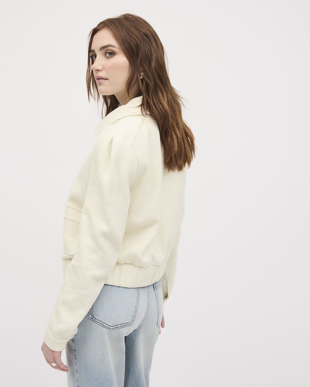 The perfect layering piece for transitional weather, add some extra style to your look with this cropped tweed bomber jacket. Featuring a shirt collar, this piece will definitely add an edge to your outfit.