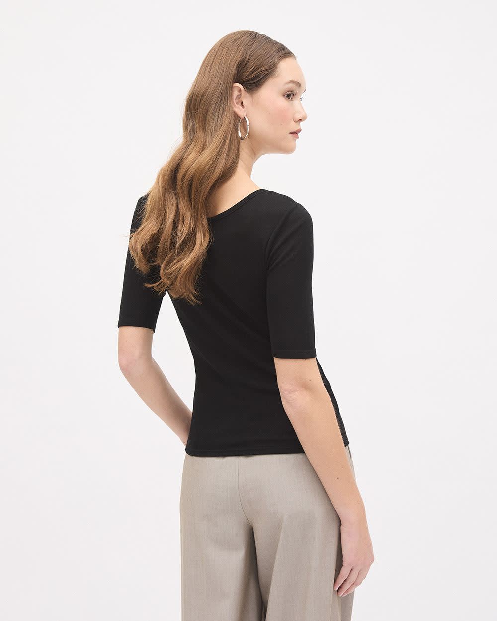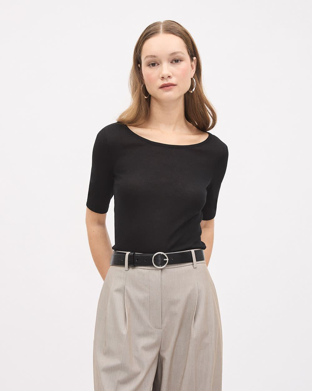 Made in a soft knit fabric, this classic top designed with elbow sleeves and featuring a scoop neckline is a perfect everyday top. Pair it with your favourite bottom for a casual look that is sure to stand out.
