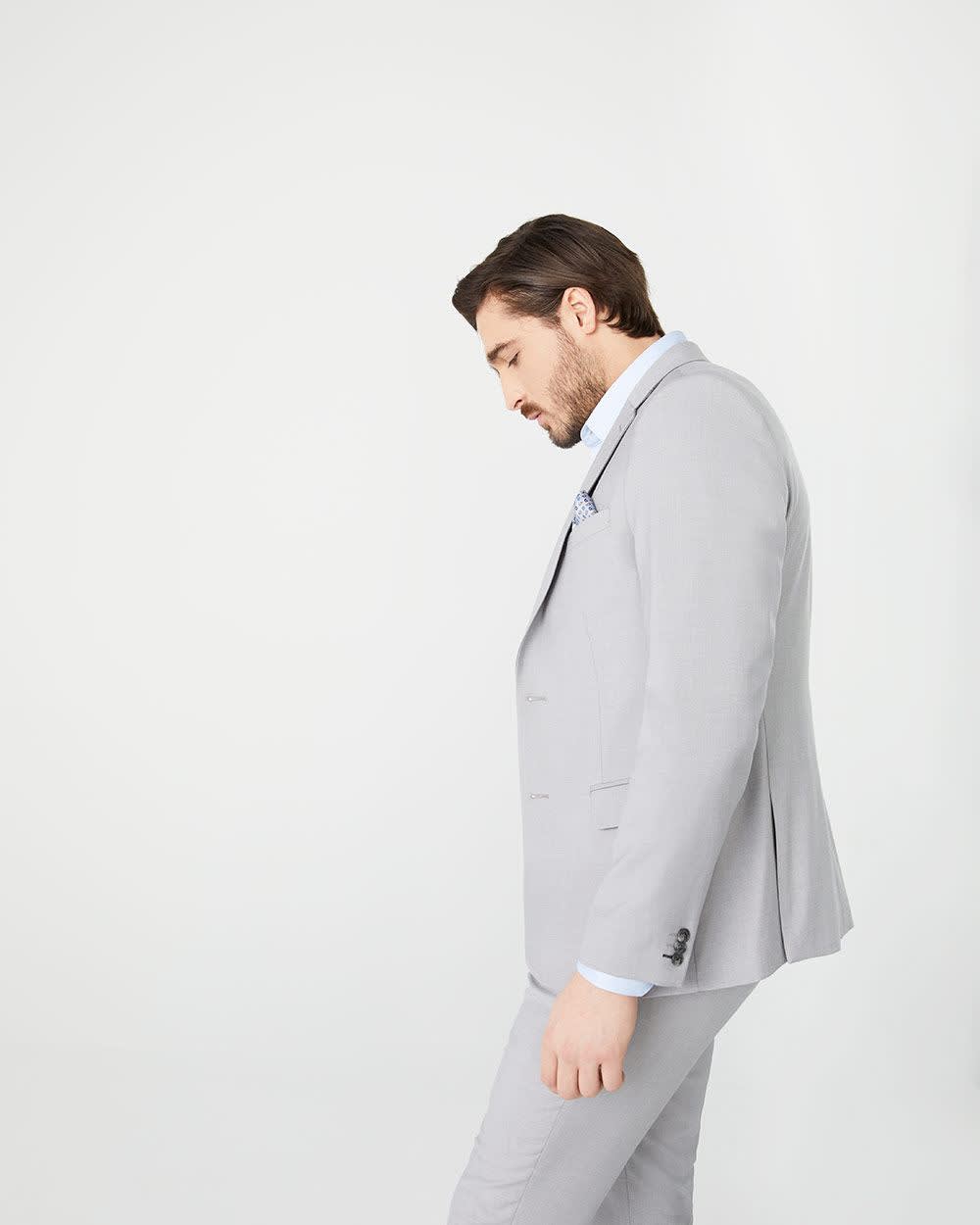 Cut from stretch heather grey fabric, this Essential slim fit blazer is a timeless piece that wears at the office or for a special occasion. Pair it with its matching Essential pant and vest to create a timeless 3-piece suit.