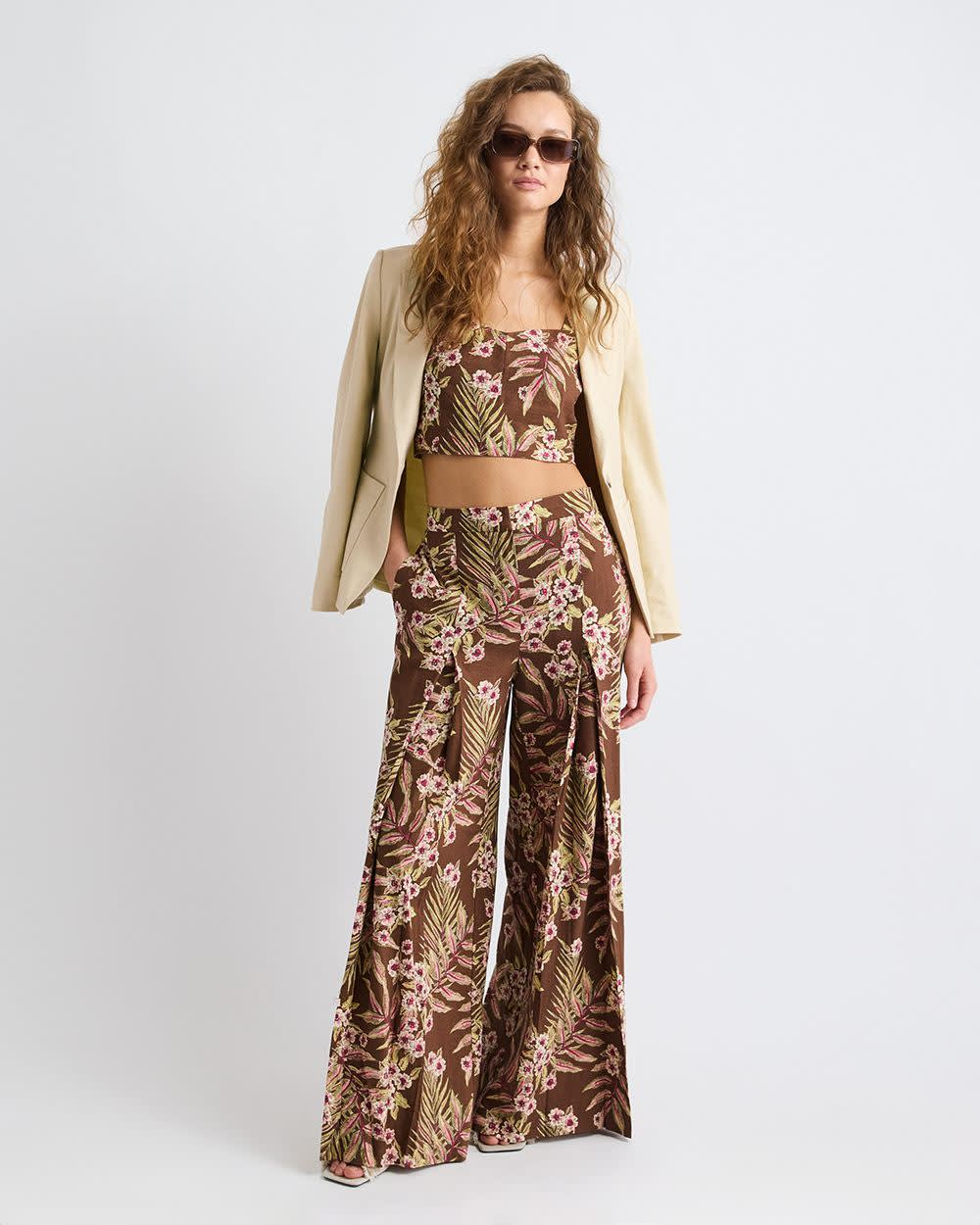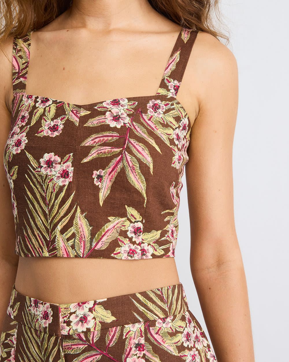 Made in a light linen blend and featuring a festive tropical pattern, this cute bustier blouse is the perfect summer top. Wear it with its matching pants for a statement style.