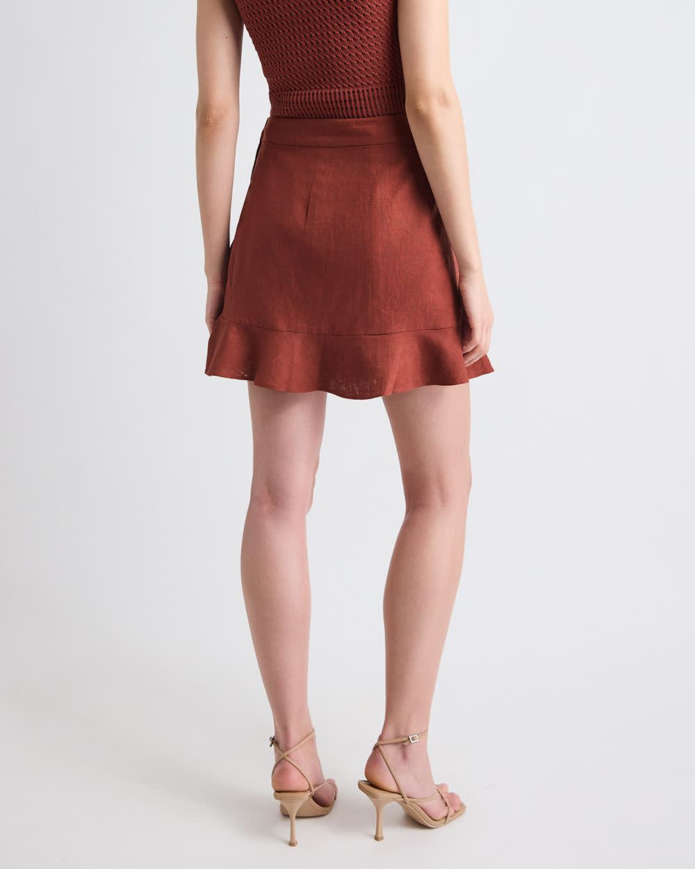 Made in a light linen and viscose blend, this beautiful faux-wrap mini skirt featuring feminine frills is a great addition to make to your summer wardrobe, as you can easily wear it for any occasions. Wear it at the office with a blouse, or on the weekend with a simple tank top.