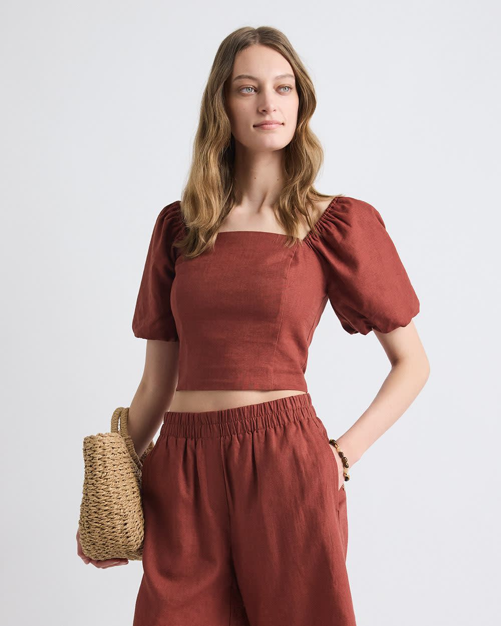 Opt for this linen and viscose blend tube top featuring trendy puffy sleeves and an elegant square neckline for a look that is sure to stand out.