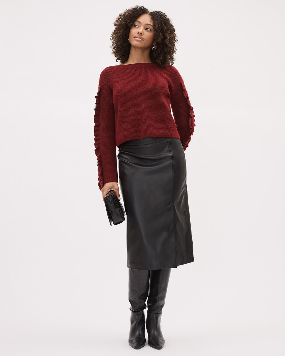 Made in a soft spongy knit with a ribbed pattern, this boat-neck sweater featuring long sleeves elevated with frills is both sophisticated and comfortable. Pair it with a pair of jeans for a casual style or dressy pants for a statement look.