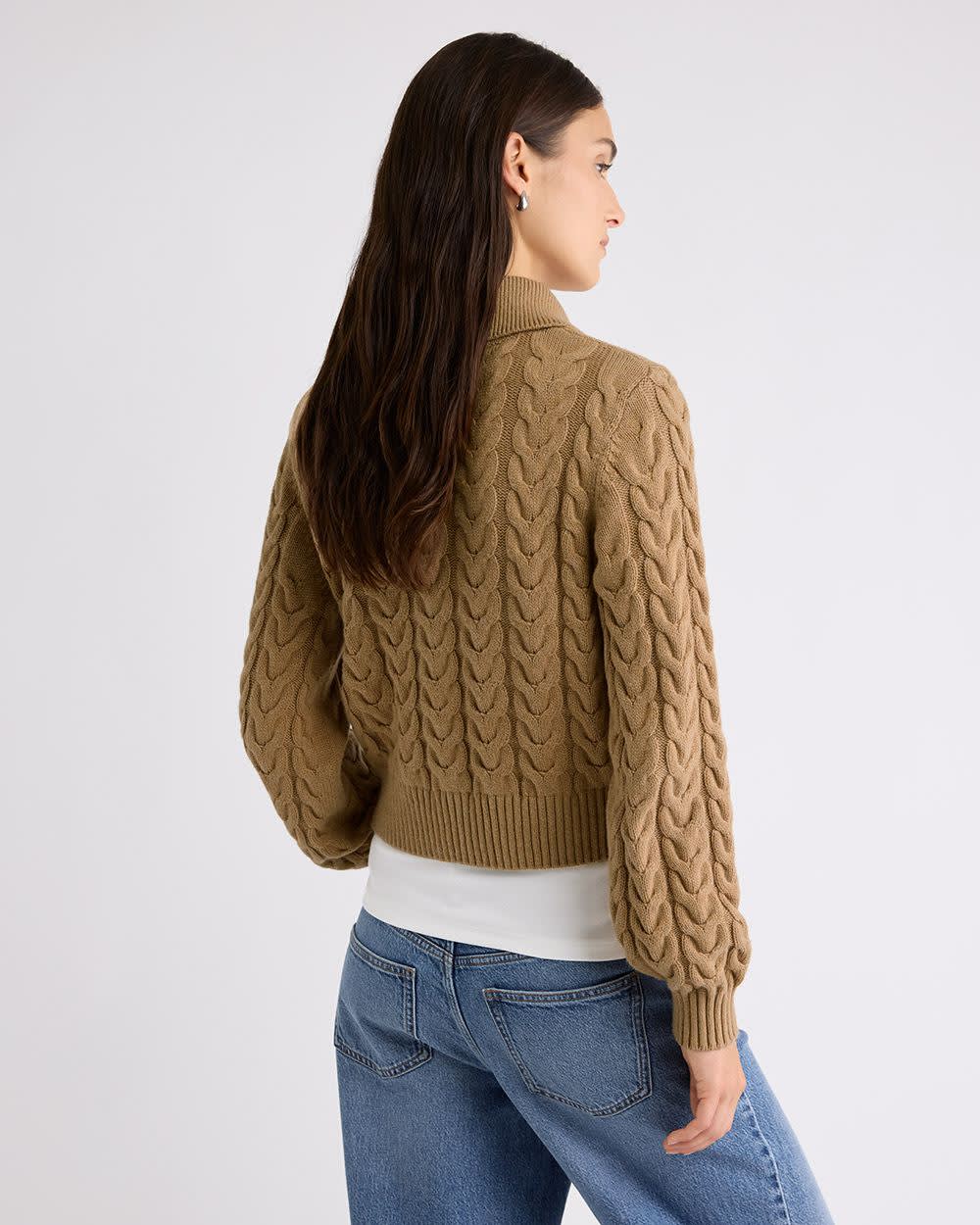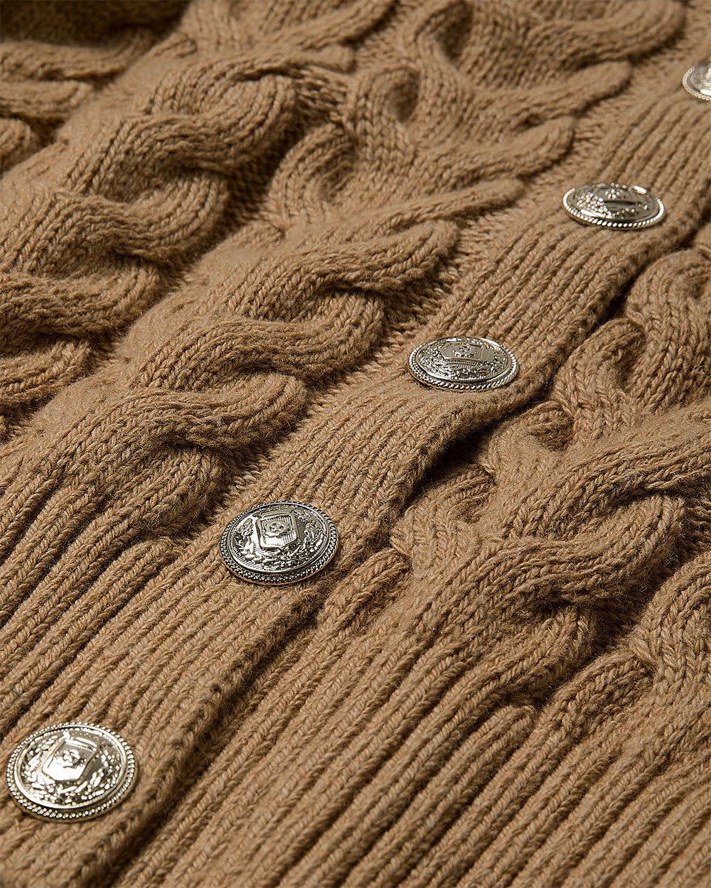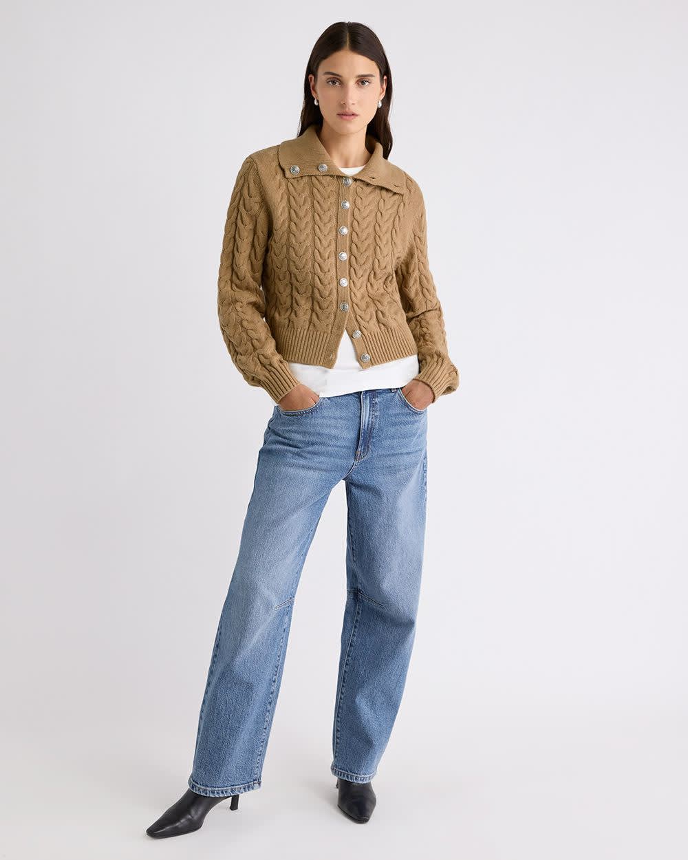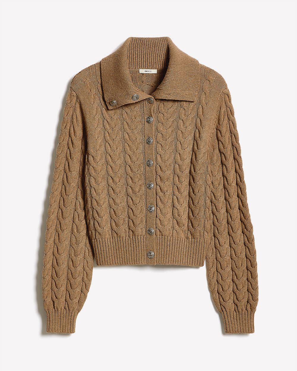 Cozy and chic, this relaxed-fit cardigan is crafted in a cashmere-like stretch knit with classic cable stitches. Designed with a polo neckline, oversized collar, and button-down front, it's an easy layering piece for effortless style.