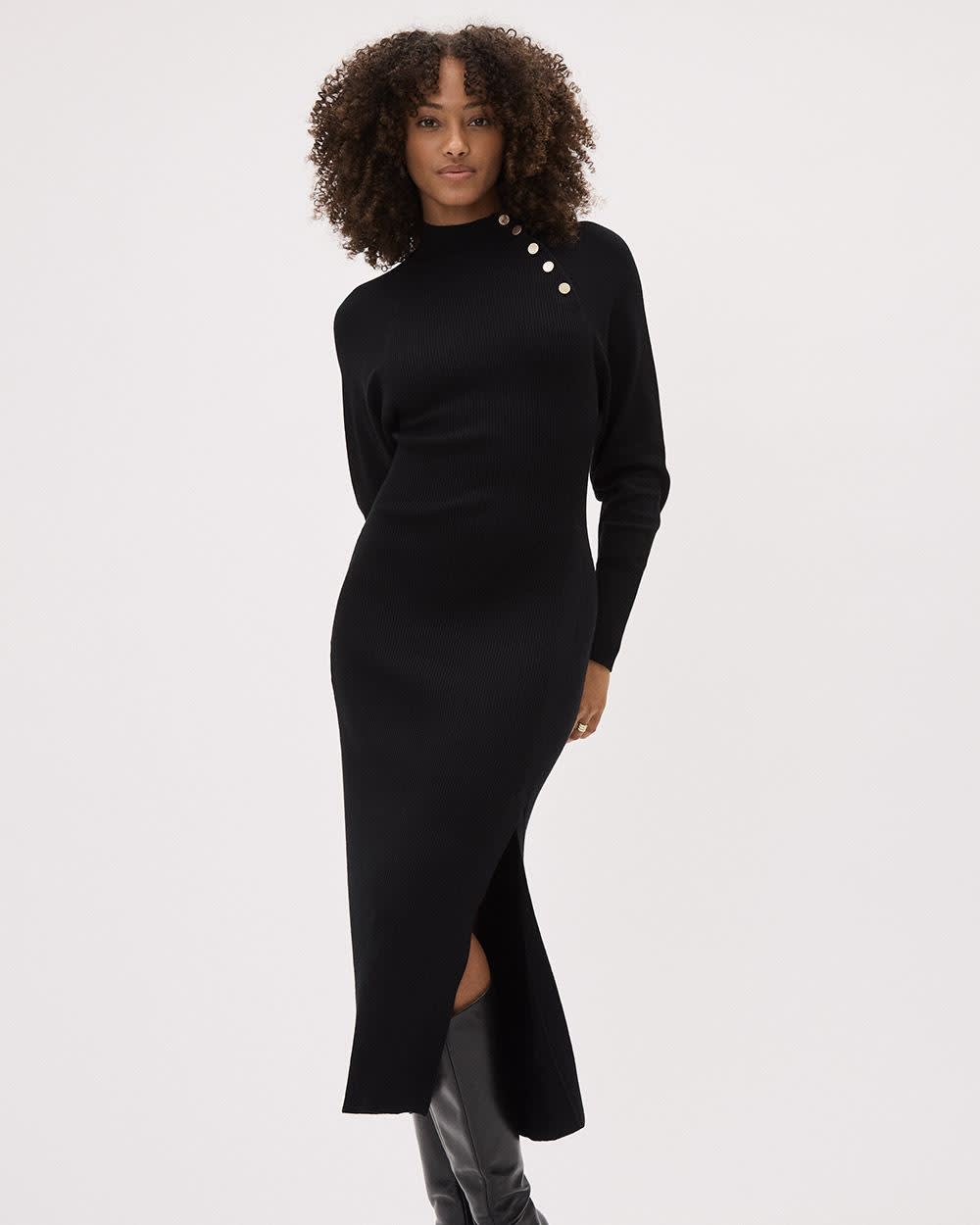 This midi dress made in a comfortable ribbed knit is a great addition to make to your wardrobe this season. With a mock neckline and details such as buttons at the neckline and a side slit, this dress is simple, yet has all the features to elevate your style.