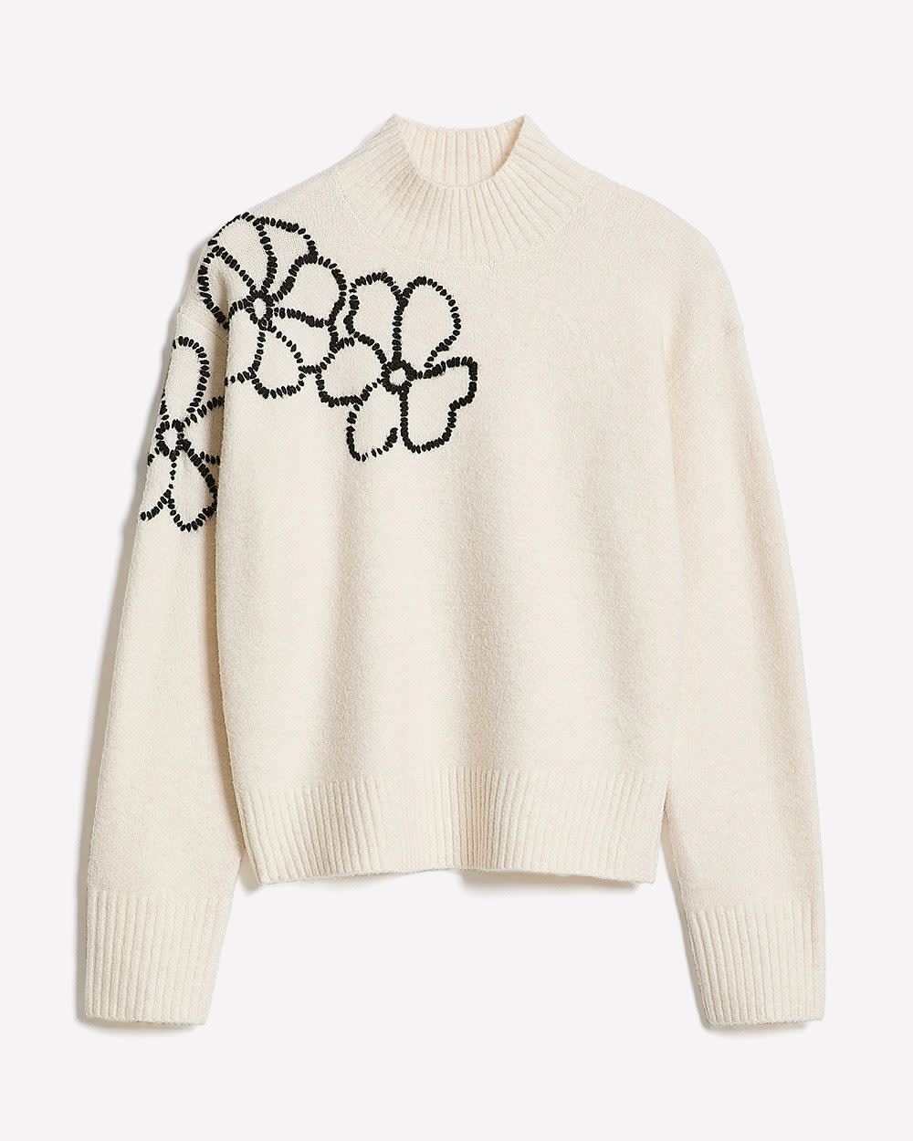 Featuring an adorable embroidered pattern, this mock-neck sweater made in an ultra-soft knit will provide you optimal comfort and a cute feminine look.