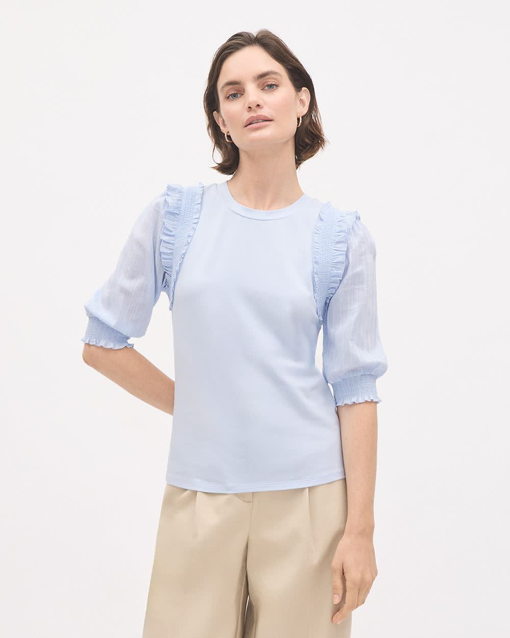 Mix-Media Crew-Neck Top with Puffy Elbow Sleeves