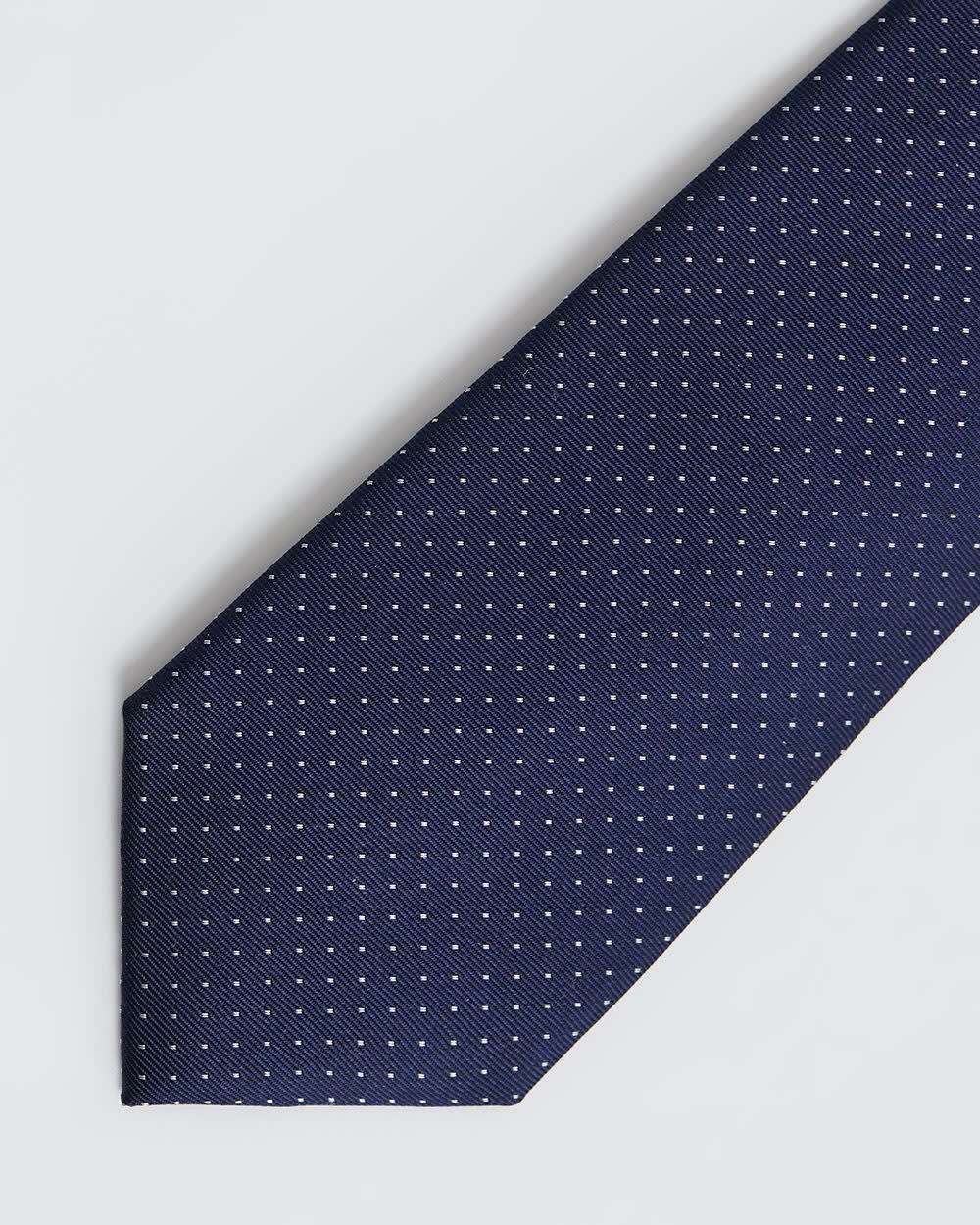 Elevate your look with this regular navy silk tie featuring a dotted pattern.