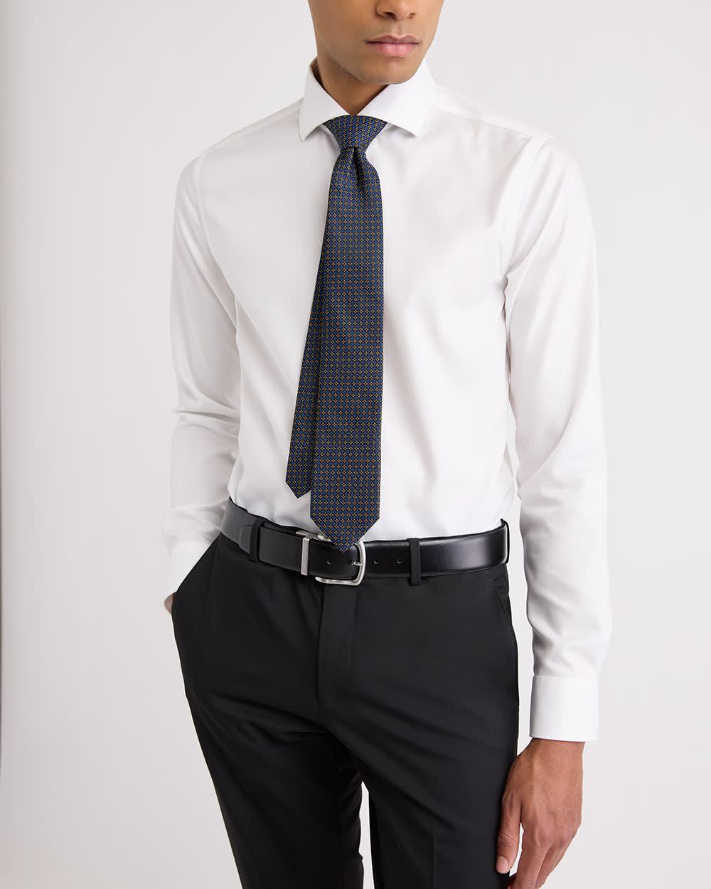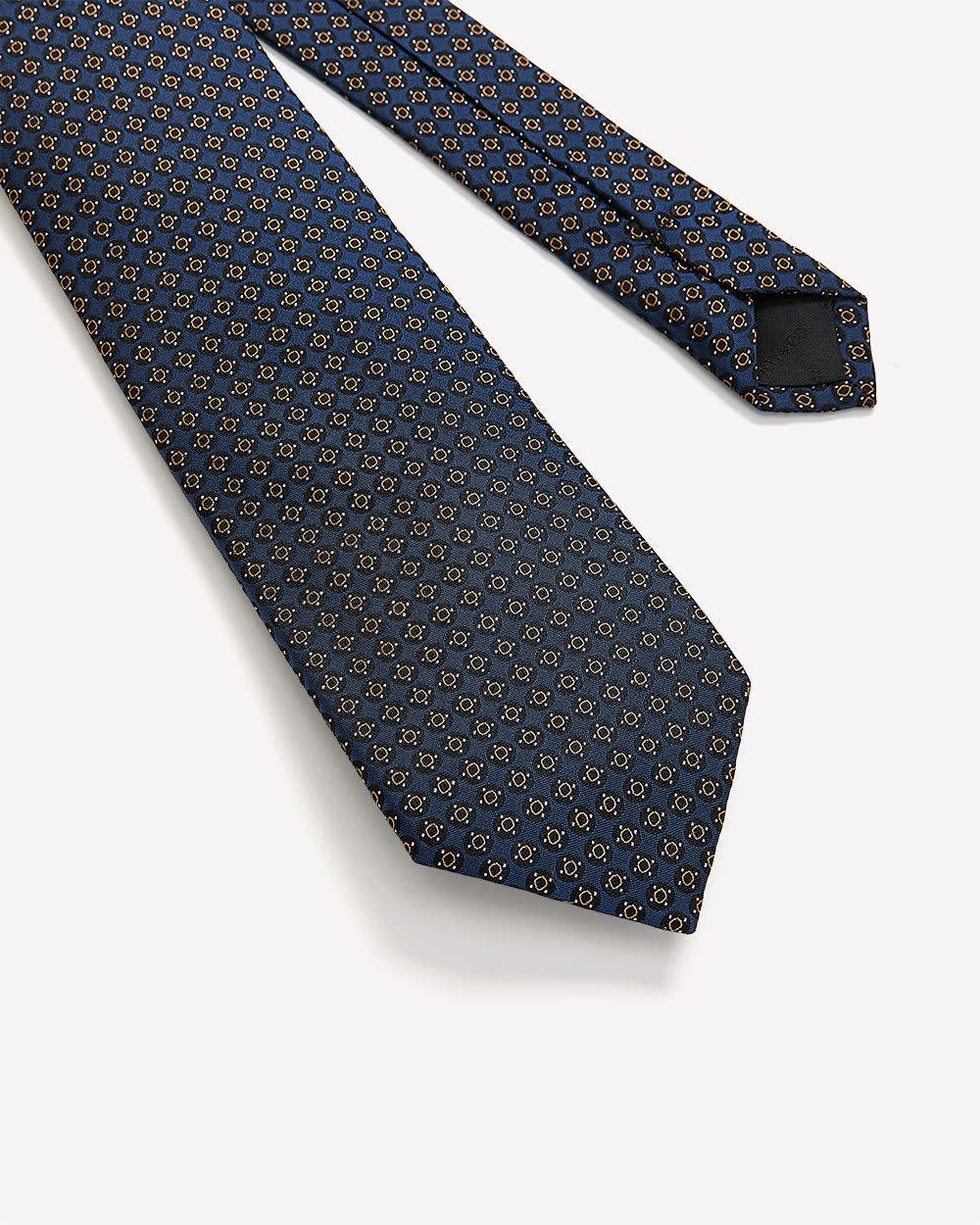 Elevate your look with this regular navy silk tie featuring a geometric pattern with circles.