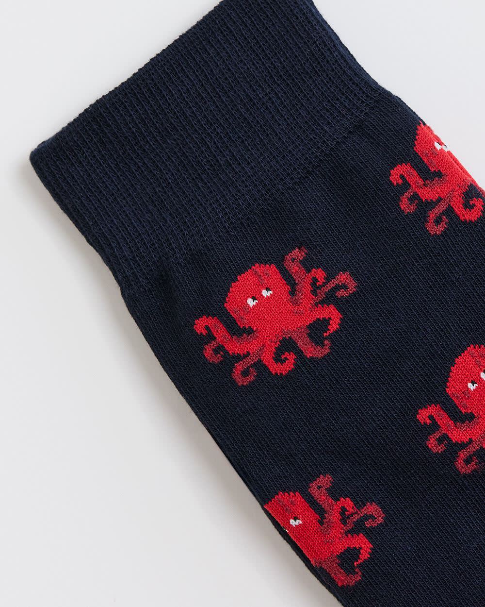 Add some personality to your outfit with these men's cotton-blend socks featuring small red octopuses.