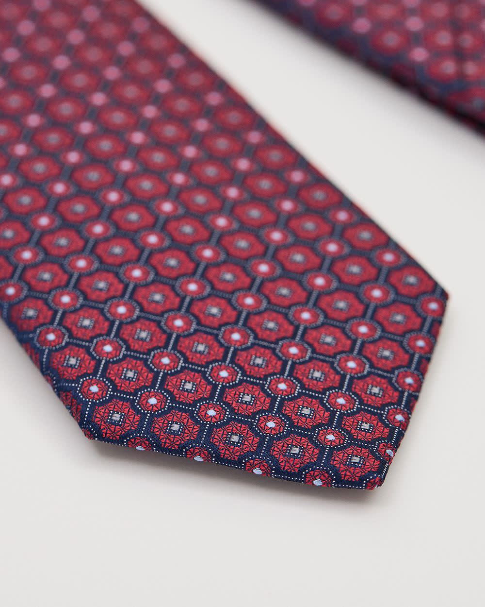 Elevate your look with this regular blue silk tie featuring a geometric pattern.