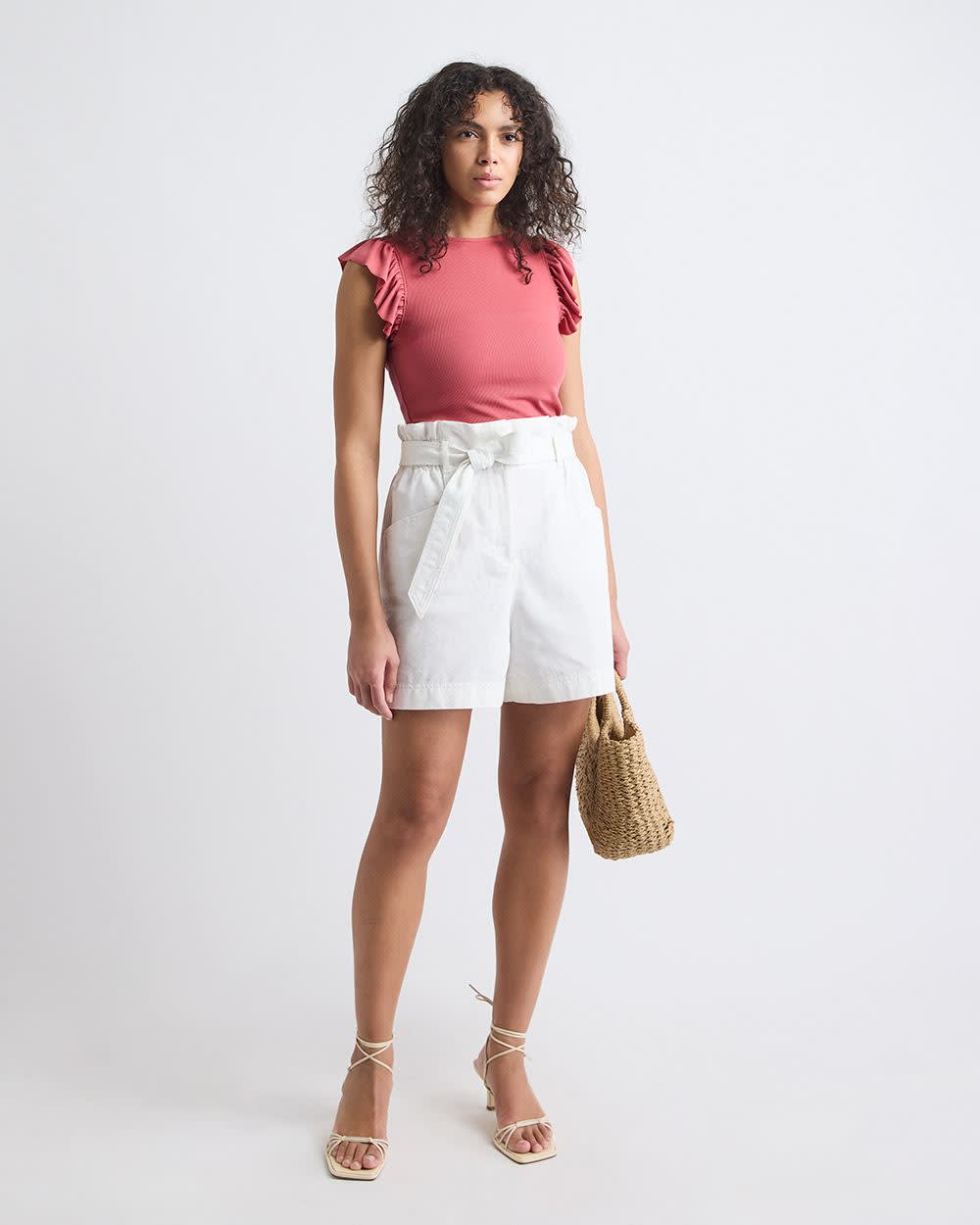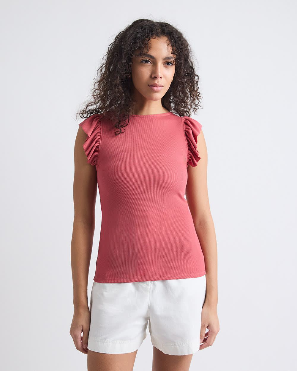 We love the flutter sleeves of this simple crew-neck top. Made in a soft ribbed knit, this top is perfect when you want to add a touch of jazz to your style.