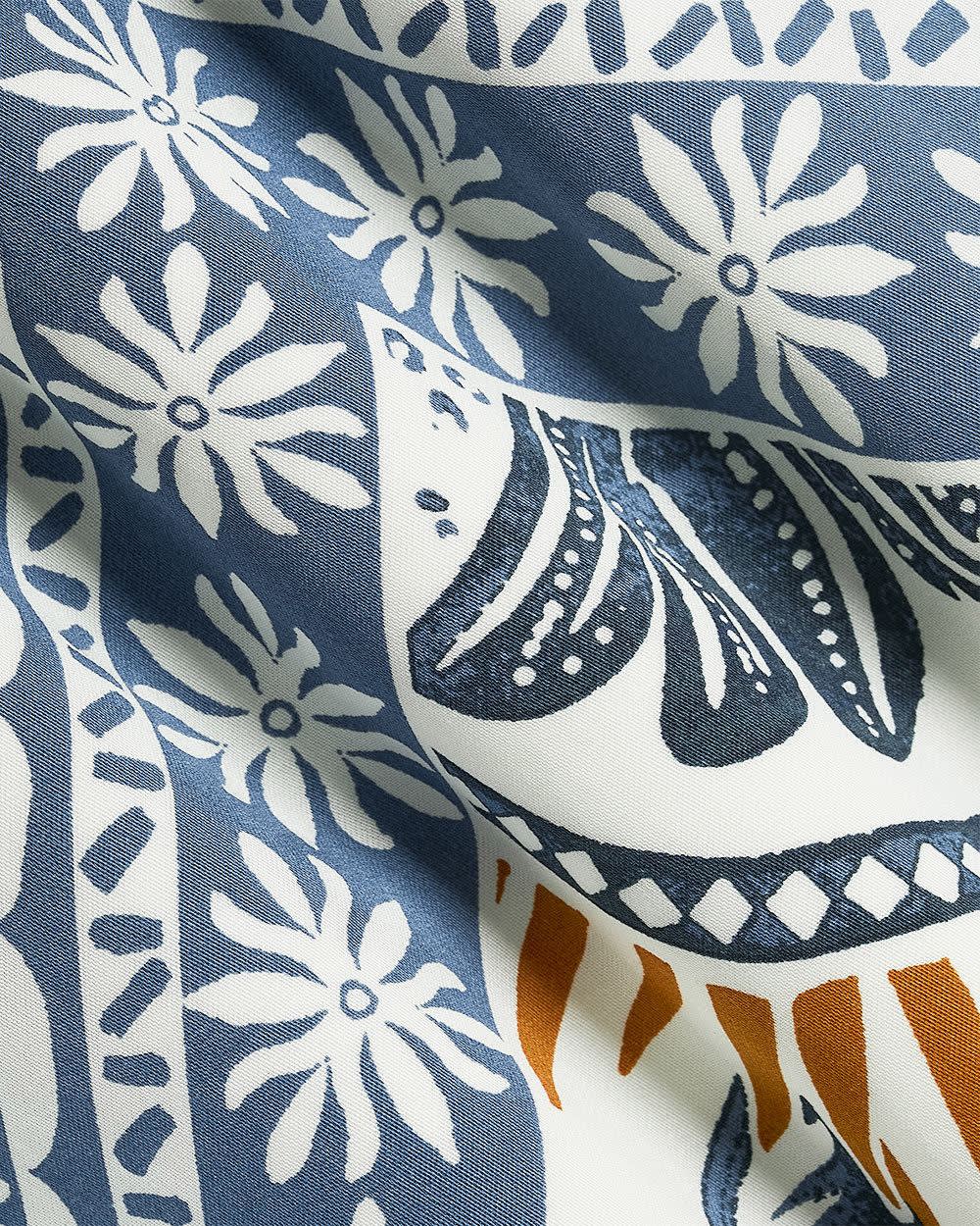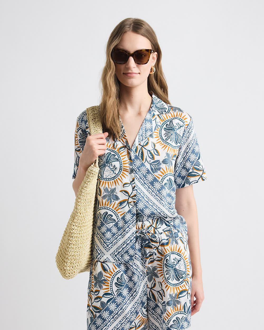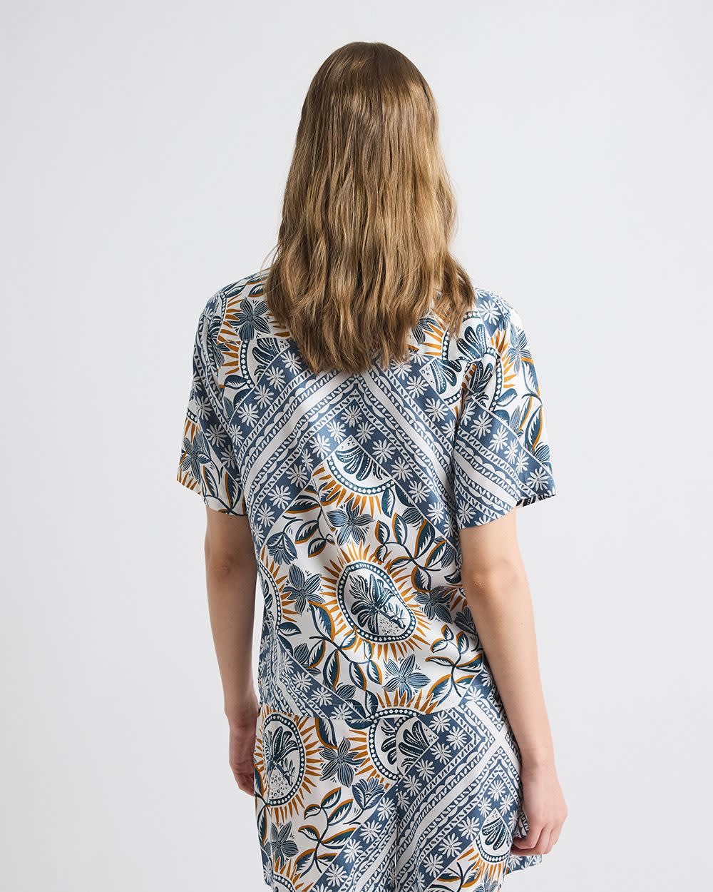 Made in a light satin fabric, this trendy buttoned-down blouse topped with a tailored collar and decorated with a beautiful print is a great piece to add some colour to your wardrobe. Wear it with a pair of linen shorts, or with its matching shorts for a true statement style.