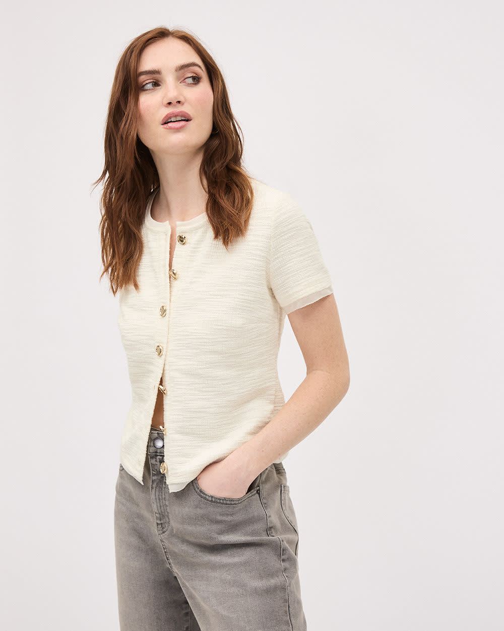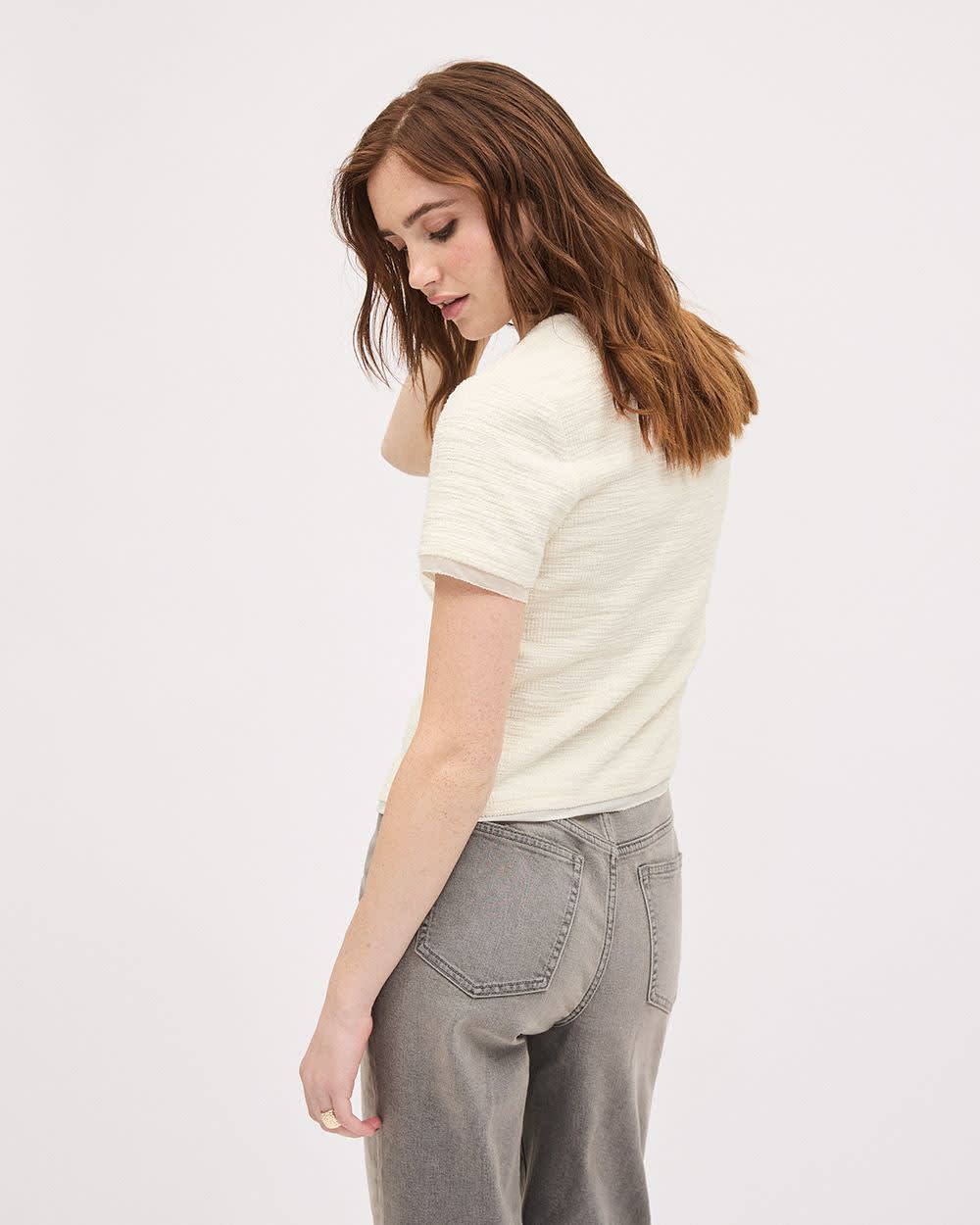 Short-Sleeve Crew-Neck Buttoned-Down Textured Top