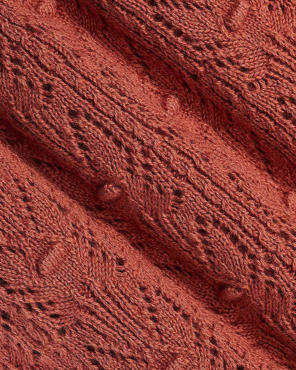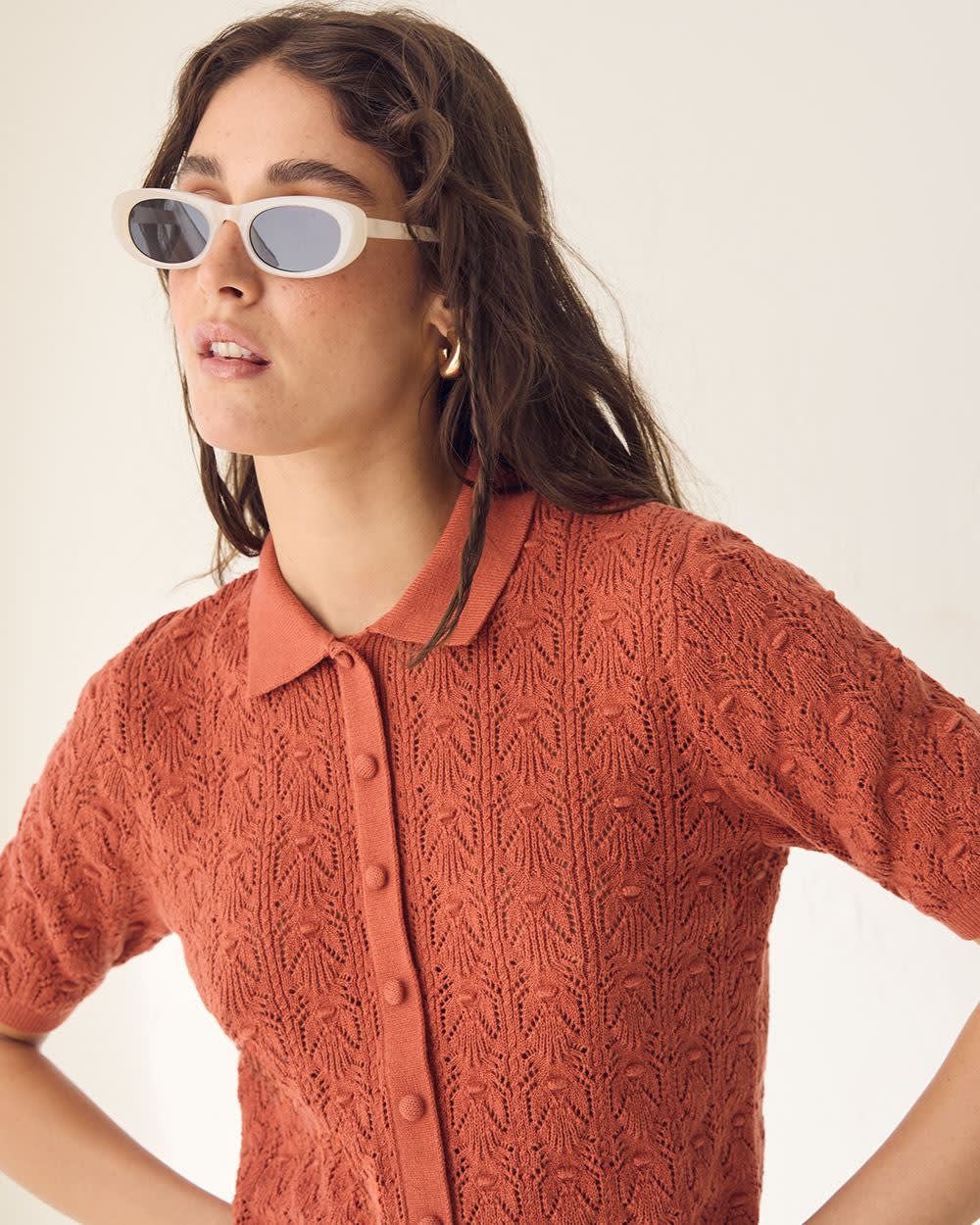 Crafted with delicate crochet patterns, this short-sleeve sweater topped with a shirt collar will undoubtedly bring a fashionable touch to your vacation ensemble.