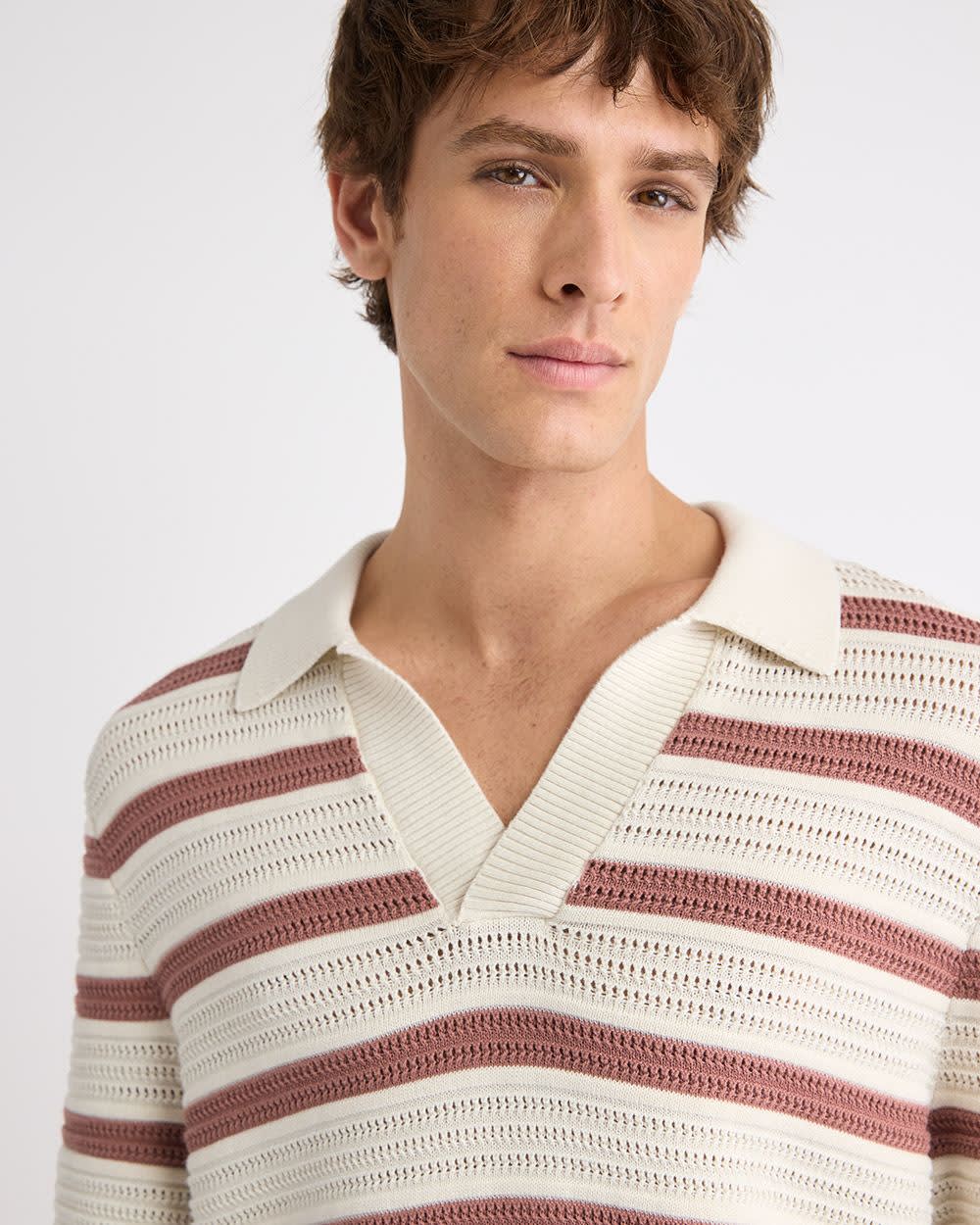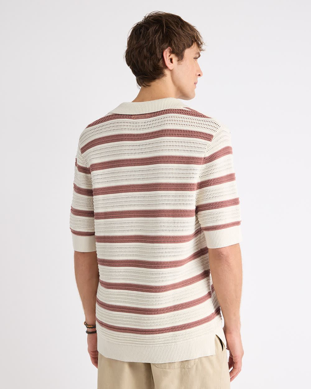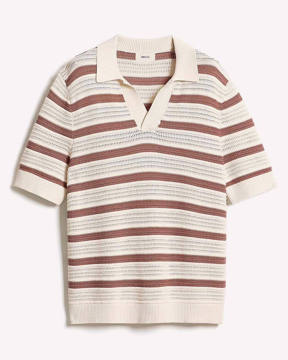 Wear this short-sleeve sweater designed with a trendy horizontal-striped pattern and topped with a Johnny collar with a pair of jeans or chino shorts. A versatile piece that does it all.