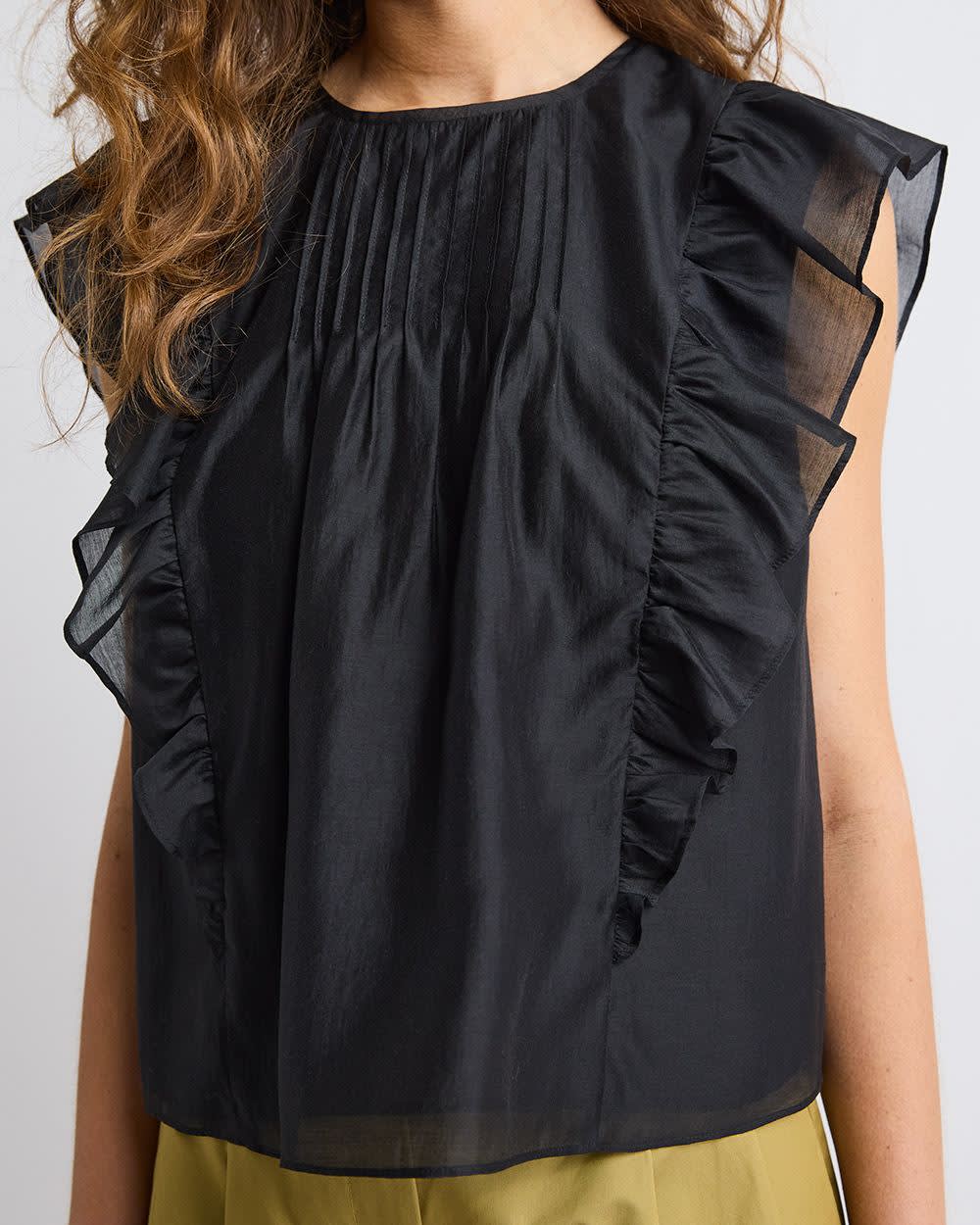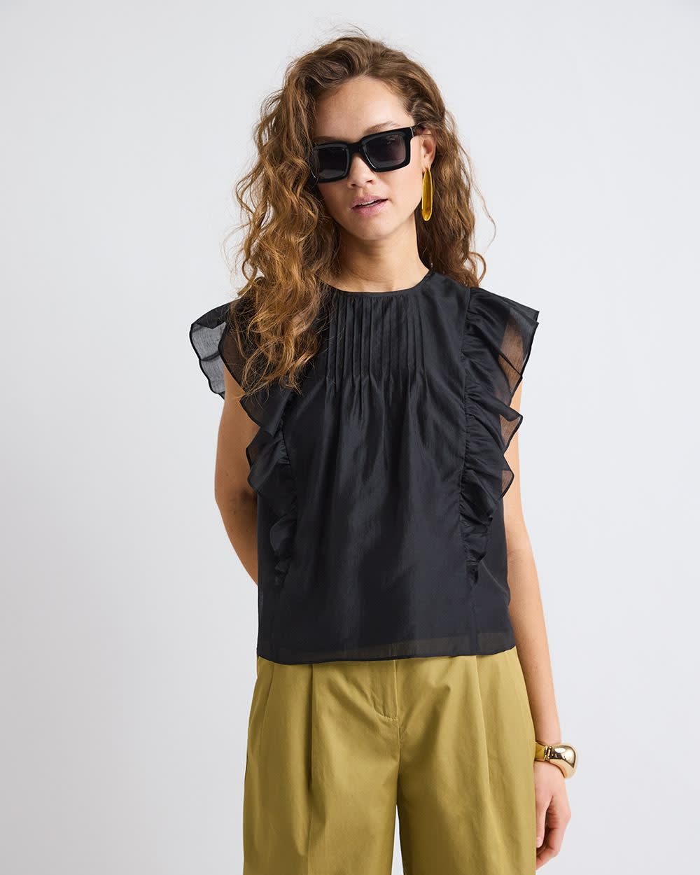 Made in a super light fabric ideal for optimal comfort on hot summer days, this sleeveless blouse featuring feminine ruffled details at shoulders pairs perfectly with a denim or linen bottom.