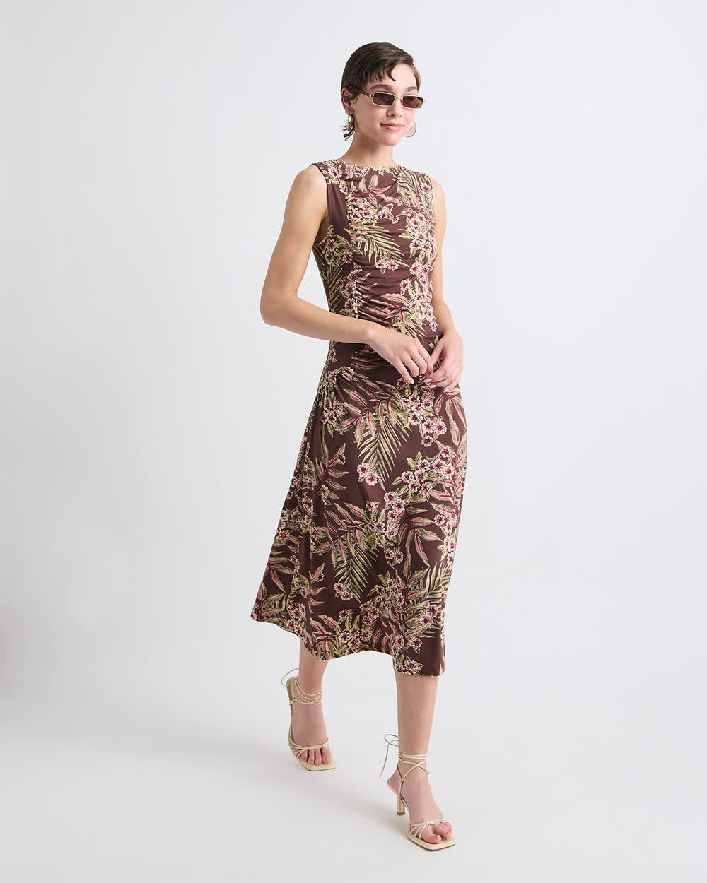 Sleeveless Crew-Neck Midi Dress with Shirred Seam