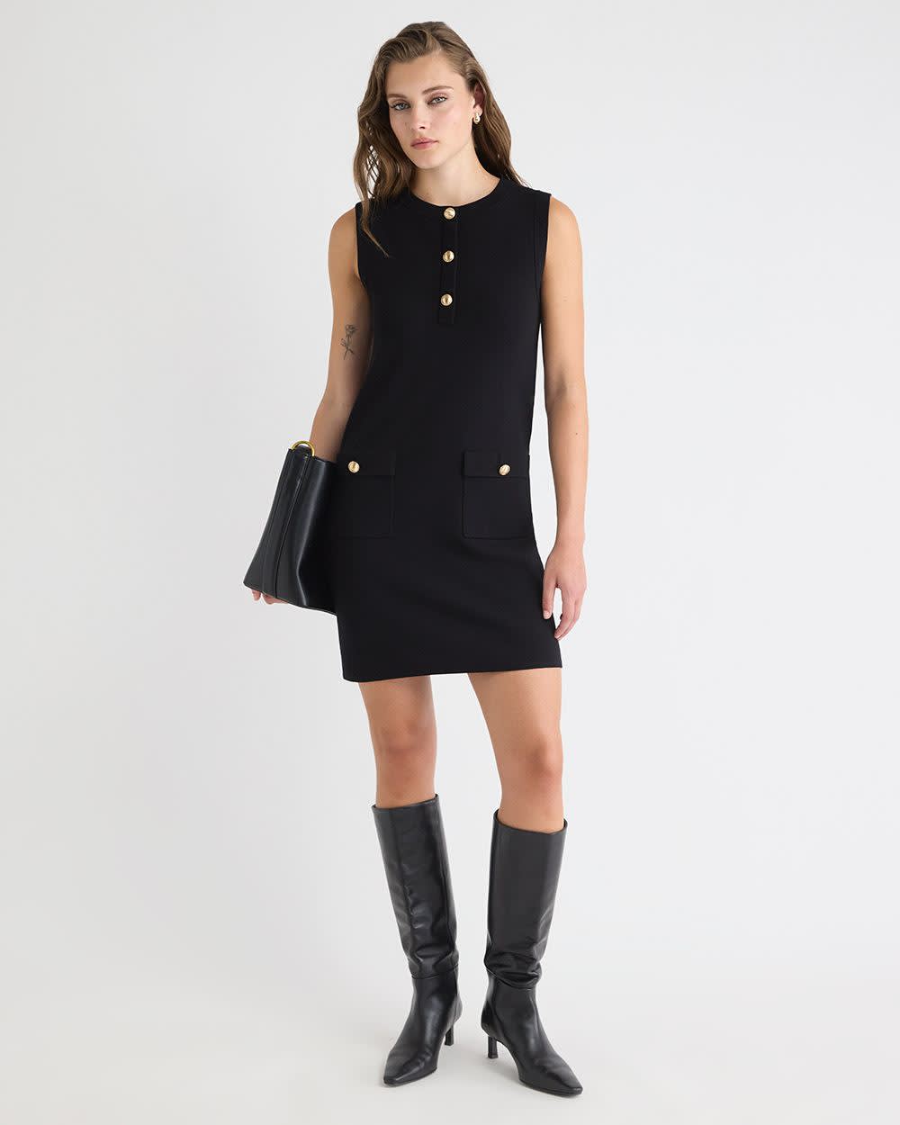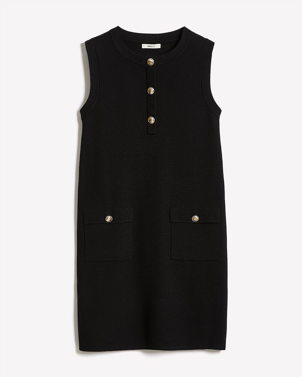 This sleeveless mini dress designed with a classic crew neckline with a buttoned placket and waist patch pockets, is an effortlessly chic piece with everyday charm.