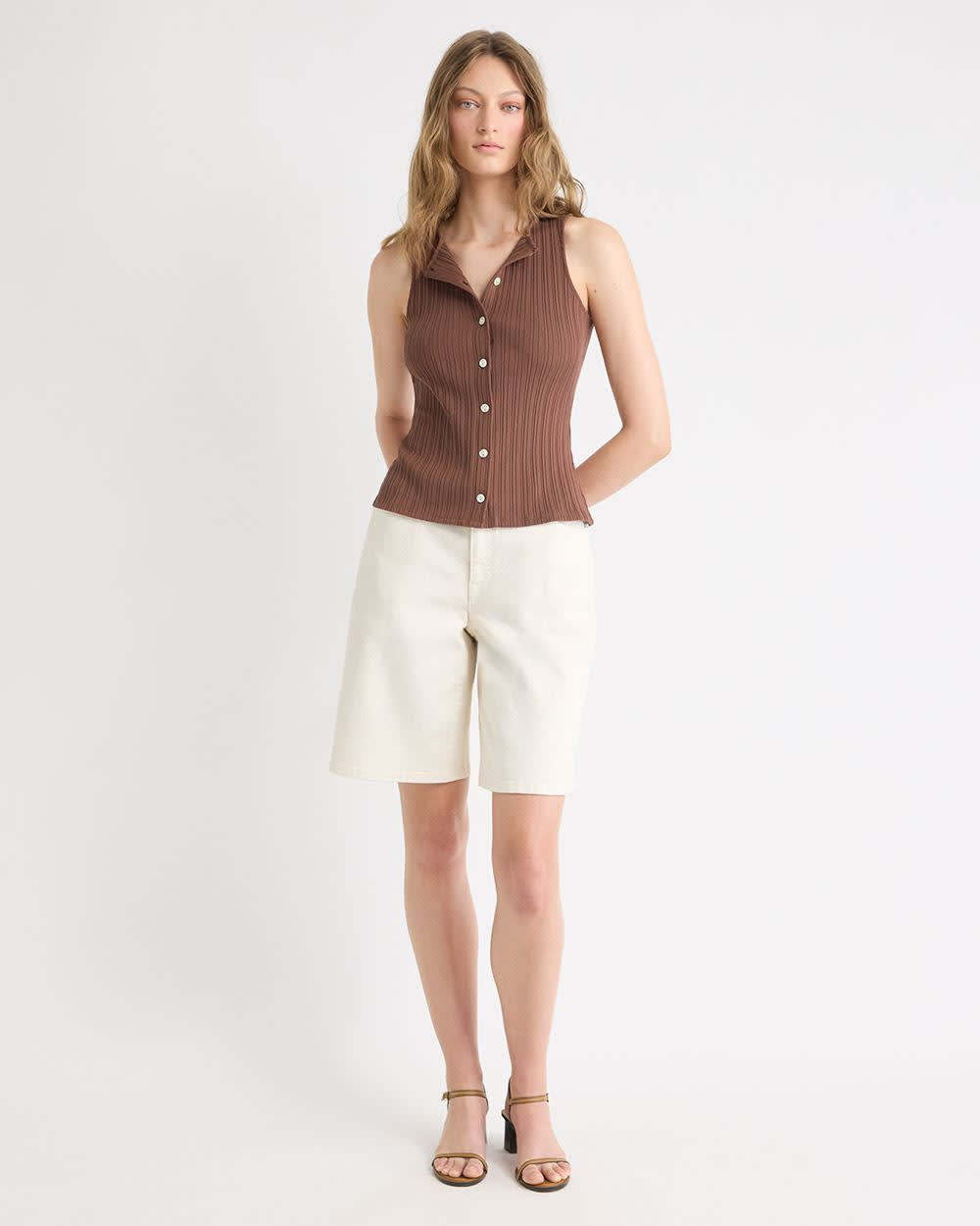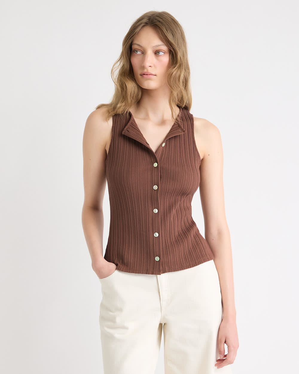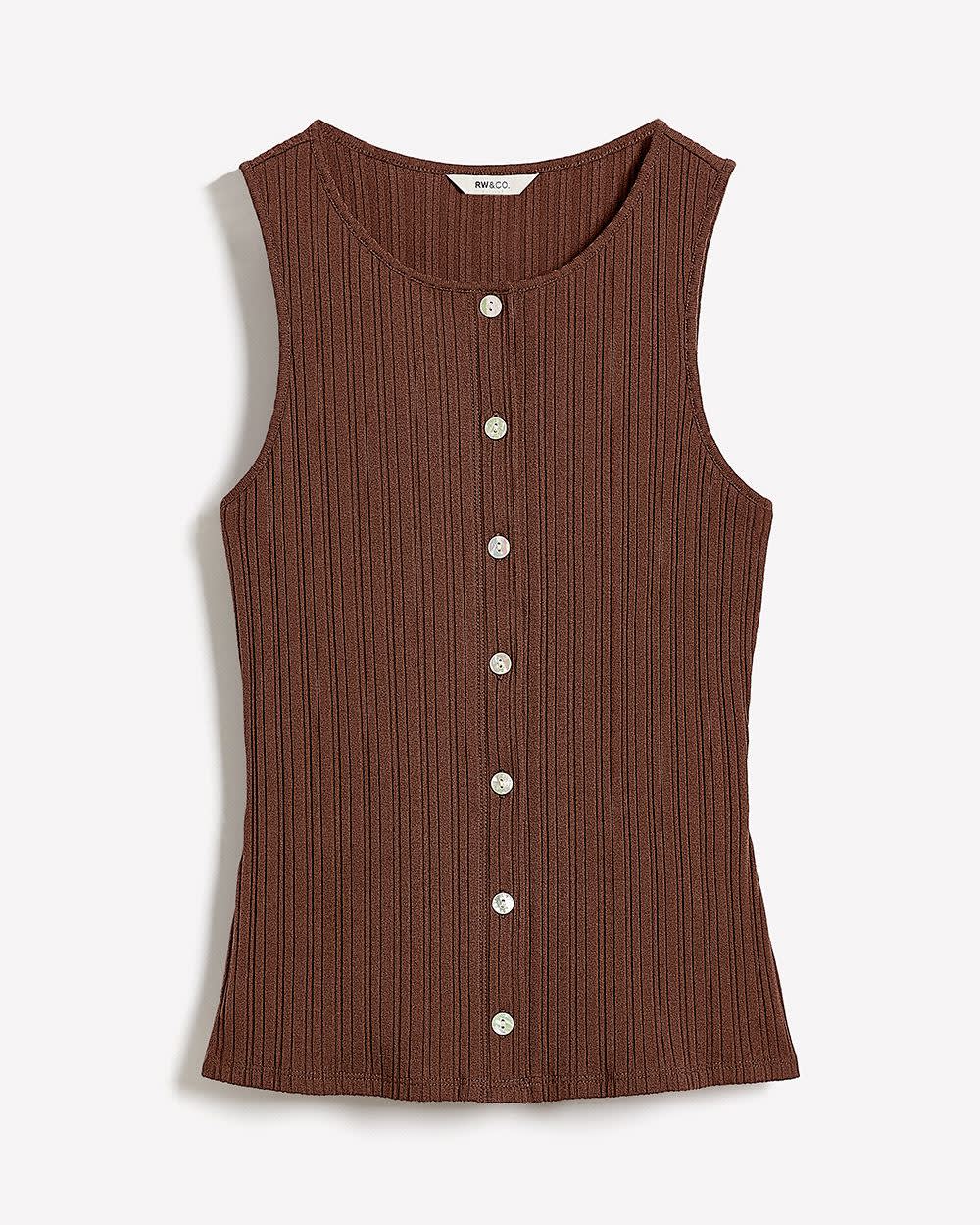 Sleeveless Crew-Neck Ribbed Buttoned-Down Top