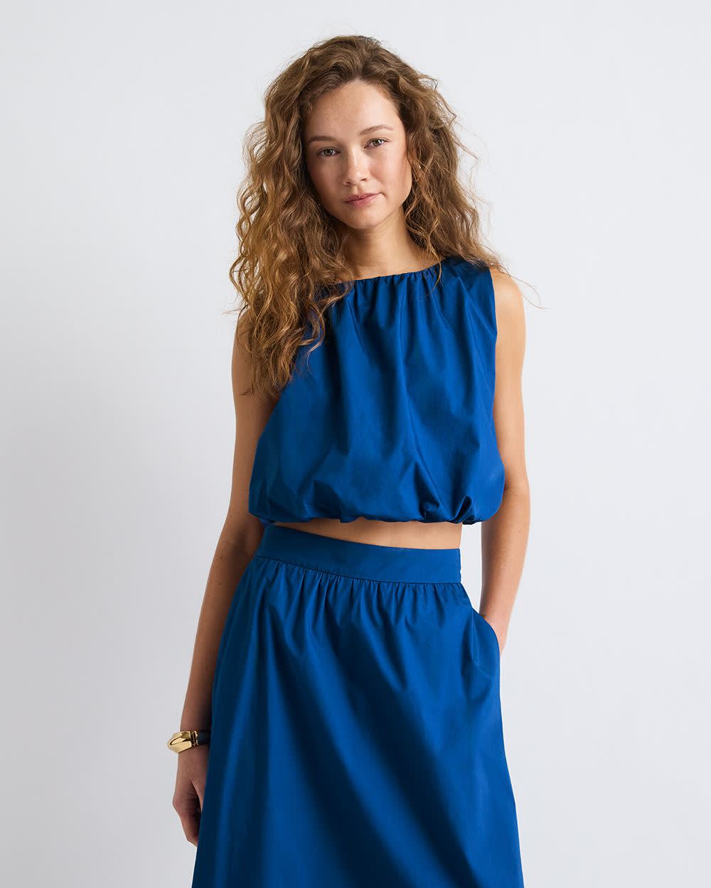 Trendy and versatile, this sleeveless cropped blouse is designed to offer you a great style. Featuring a comfortable elastic waist that creates that cute bubble fit that we love.