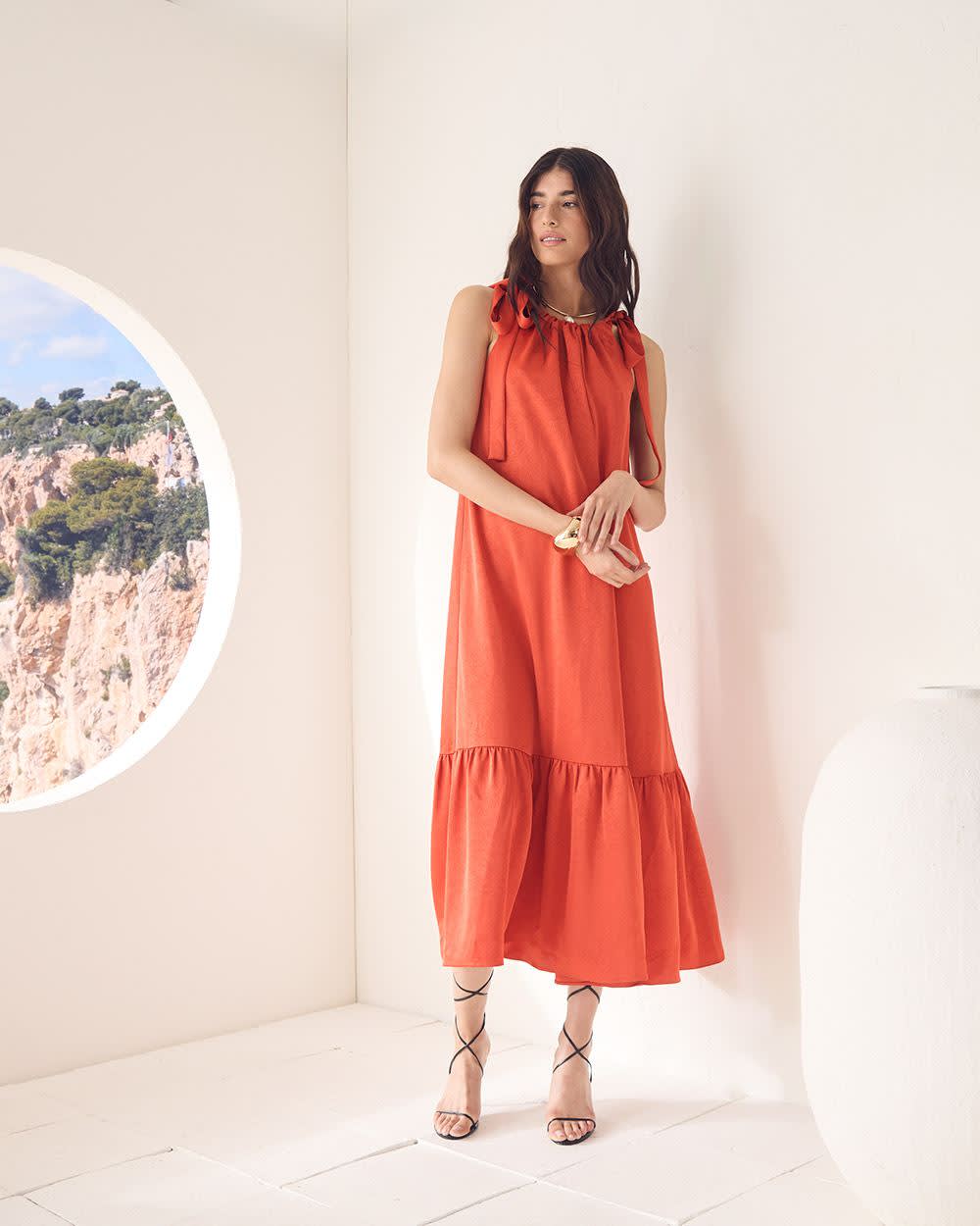Beautiful, this sleeveless halter-neck dress is just what you need for an easy outfit that dresses up perfectly day and night. A must have for your next sunny vacation.