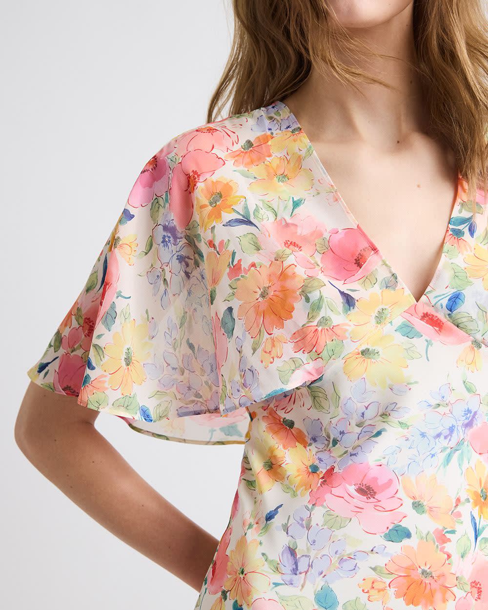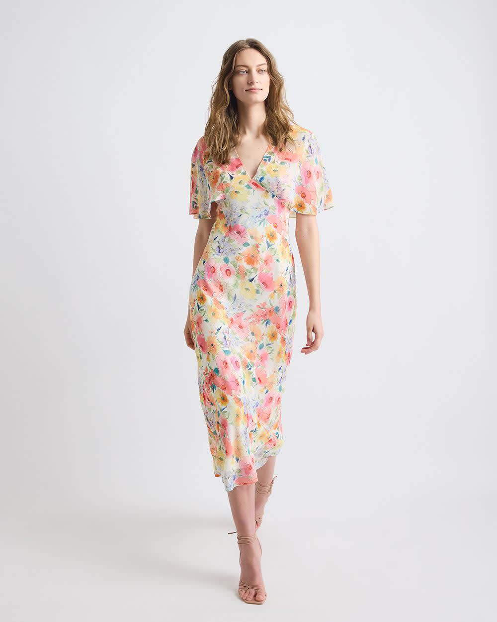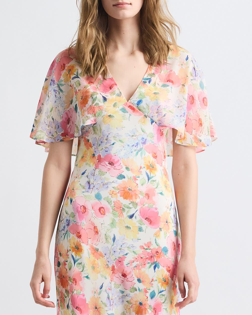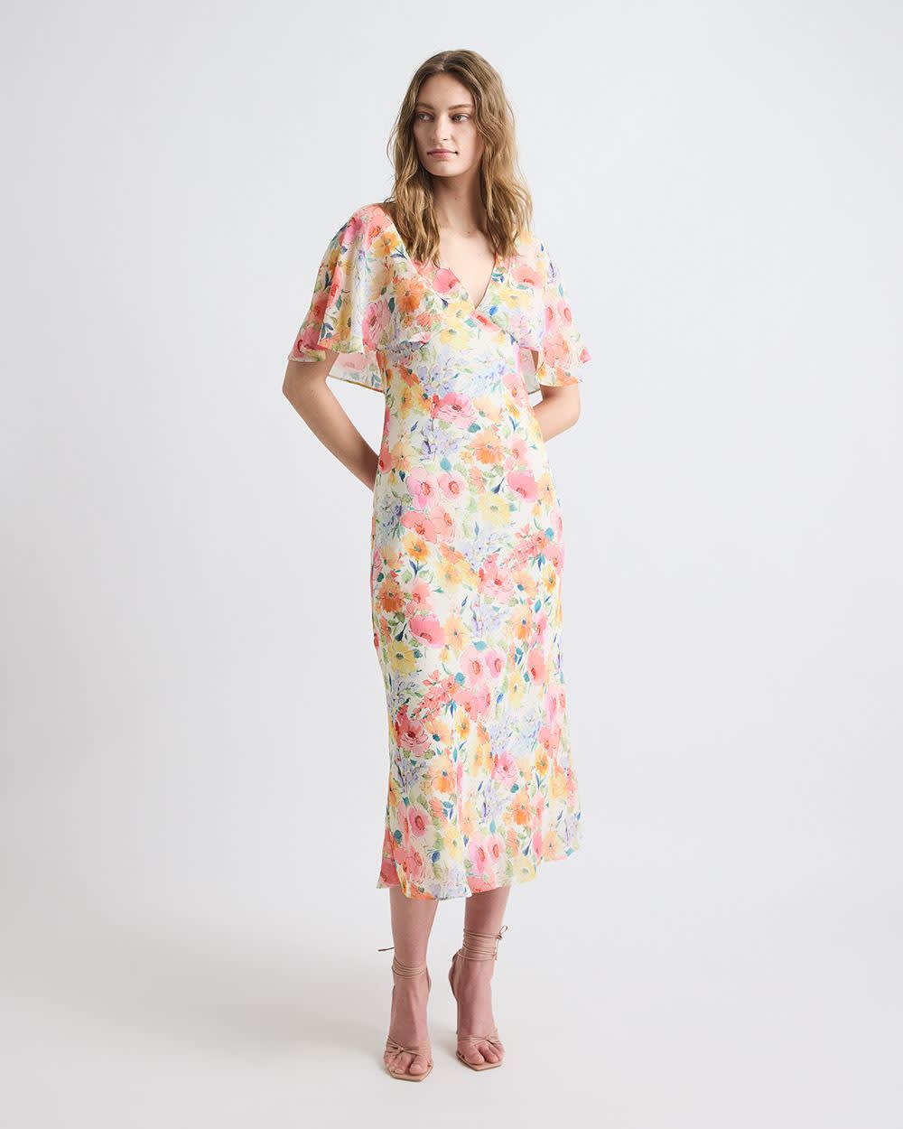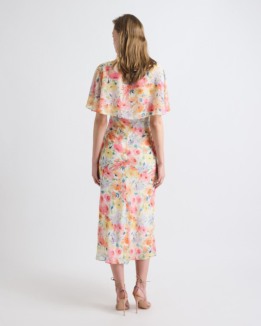Made in a beautiful chiffon fabric, this midi cocktail dress featuring an elegant cape to cover your naked shoulders is the perfect piece to wear on any special occasion this summer.
