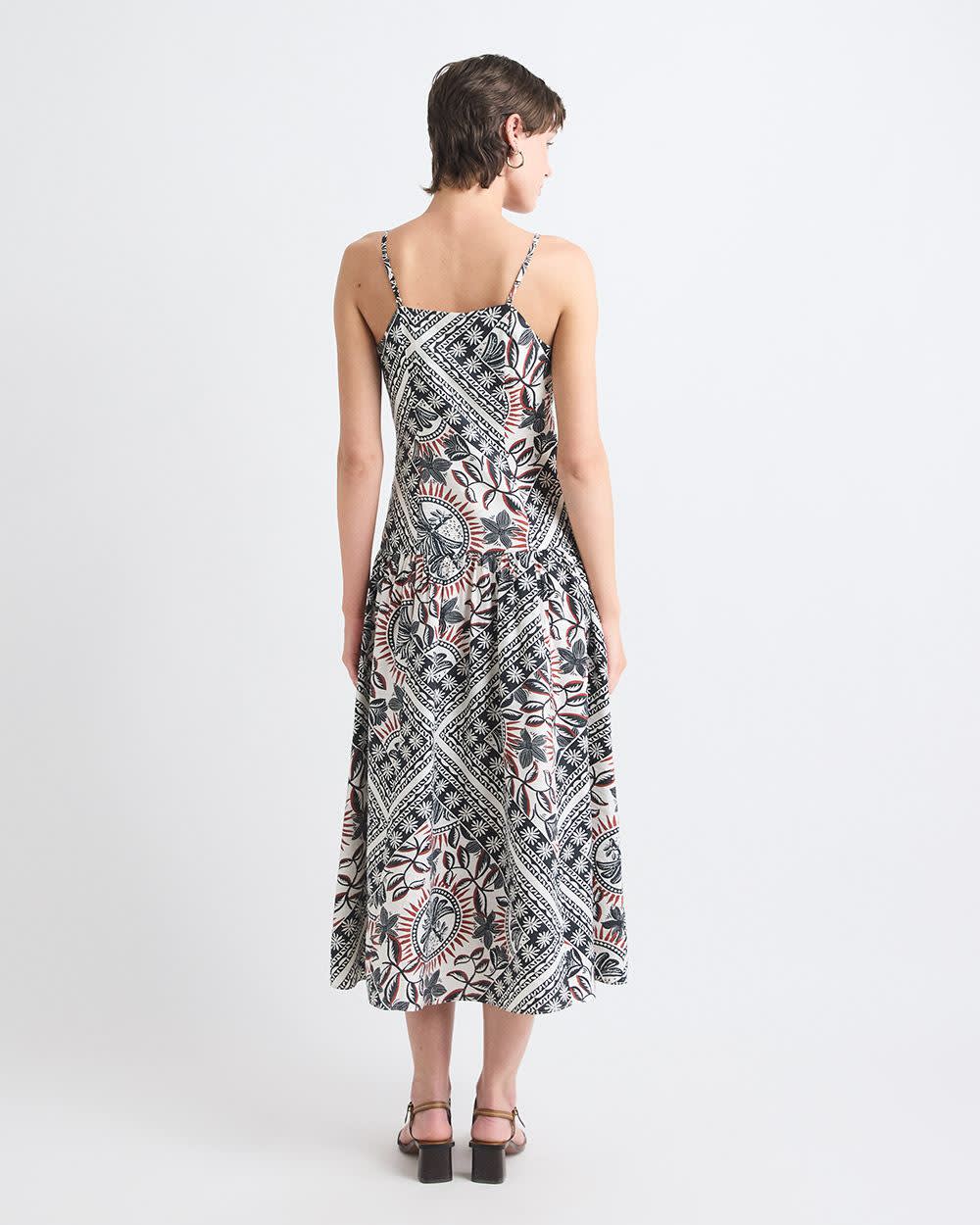 Super trendy, we love the light viscose and linen blend fabric of this sleeveless midi dress decorated with a beautiful print. Designed with adjustable spaghetti straps and a cute drop waist, this dress is perfect for summer.