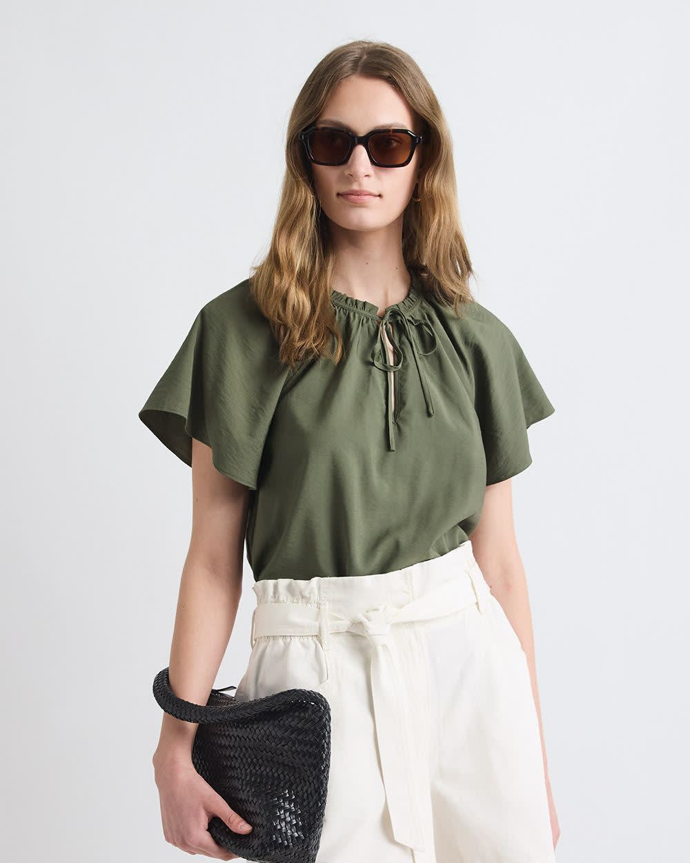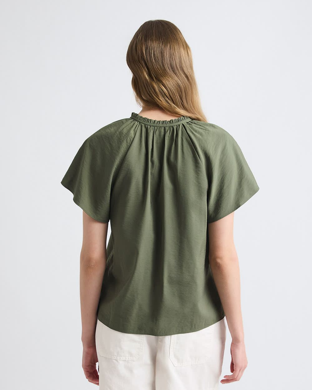 This beautiful blouse designed with a split neckline, short flutter sleeves and adorable ruffles at neckline is the perfect summer top. Wear it for picnics in the park, casual strolls around the city, or for dinner with friends.