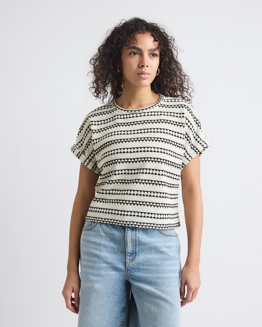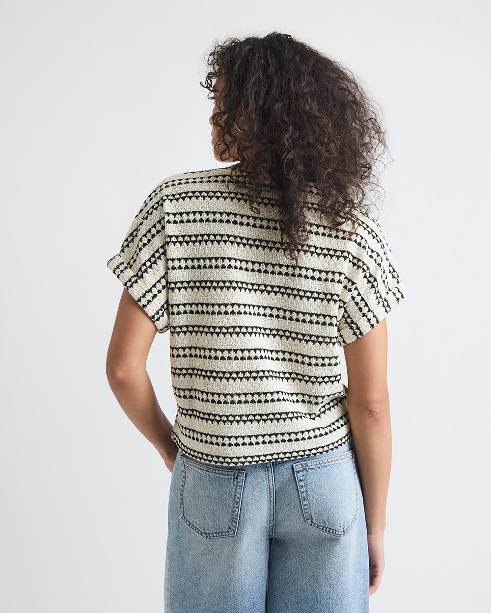 Striped Extended-Sleeve Crew-Neck Crochet Top