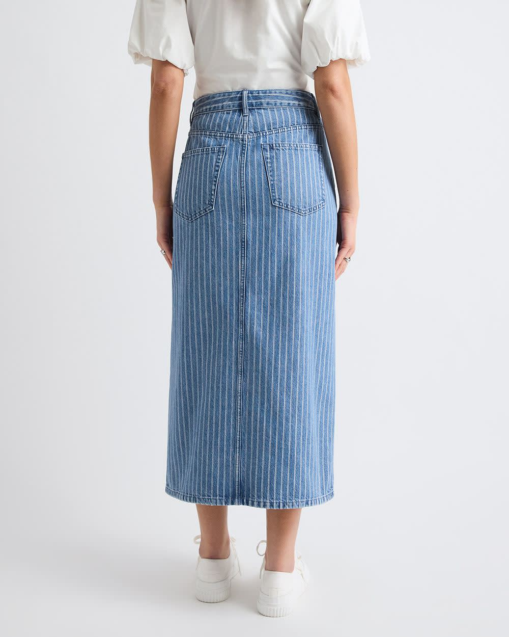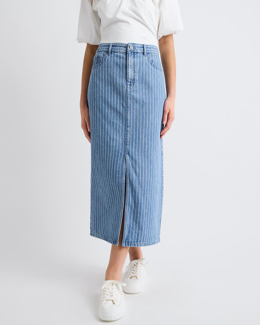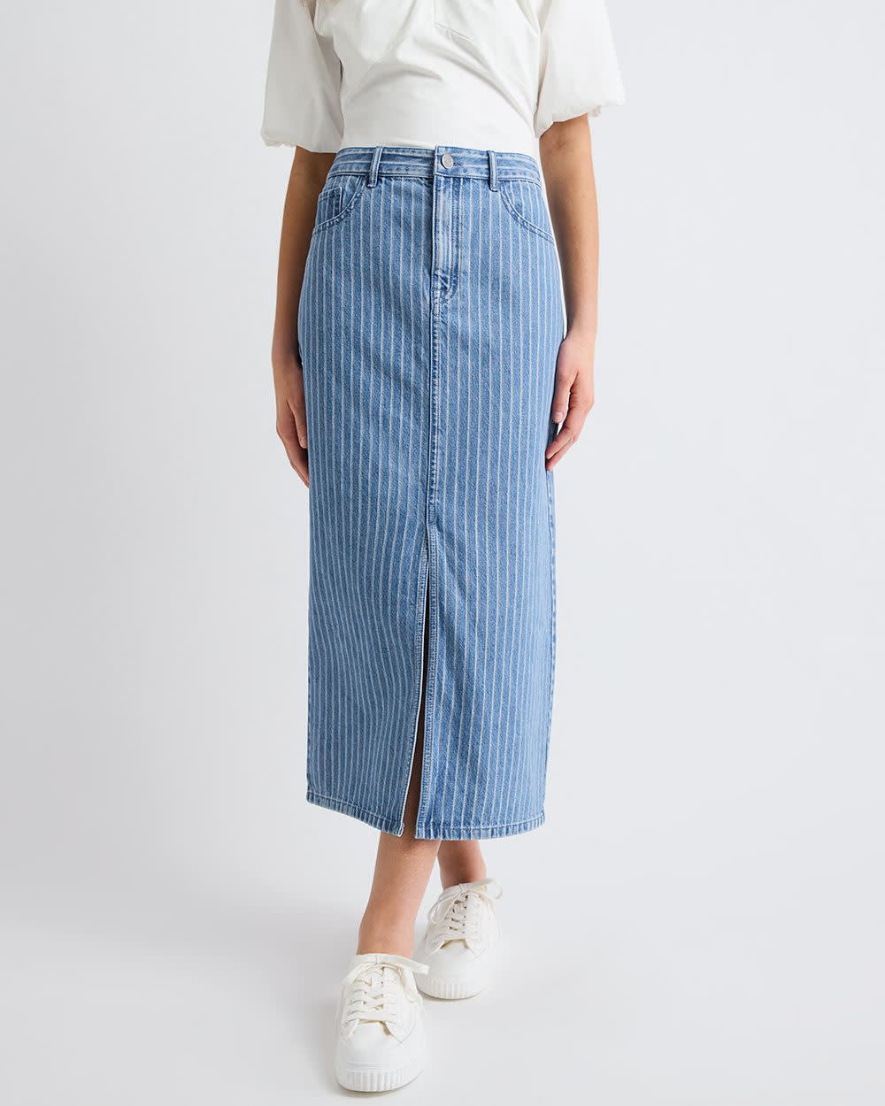 Super trendy, this long denim skirt designed in a striped pattern is perfect for the warm season. Pair it with a cute blouse or a simple tee for a fun and feminine summery style.