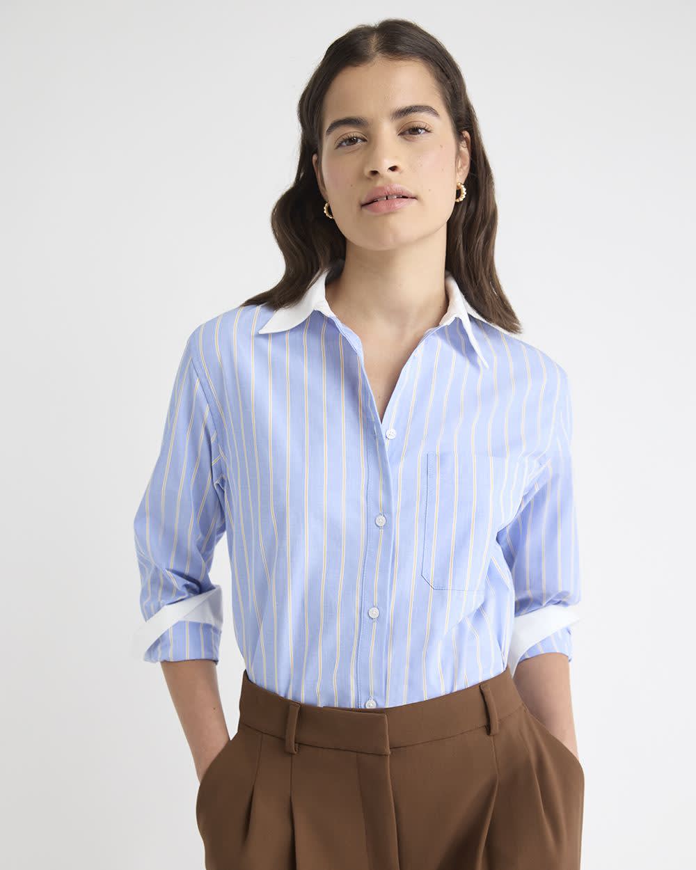 Striped Long-Sleeve Buttoned-Down Poplin Blouse with Contrasting Details