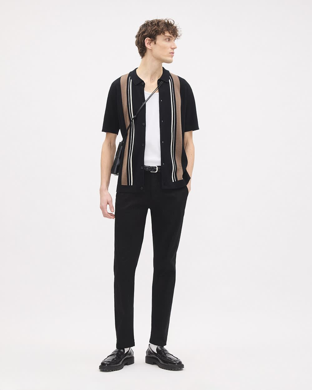 Striped Short-Sleeve Buttoned-Down Sweater with Shirt Collar