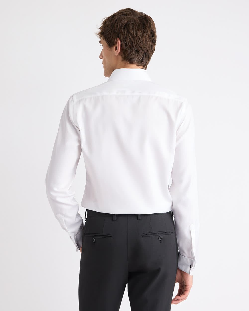 A white slim-fit tuxedo shirt is an essential piece to have in your wardrobe. Made in high-quality Supima cotton and treated to get rid of wrinkles quickly, this dress shirt is always ready to be worn, even after a long trip folded in your suitcase. Dress for special occasion without any worries with this sophisticated tuxedo shirt.