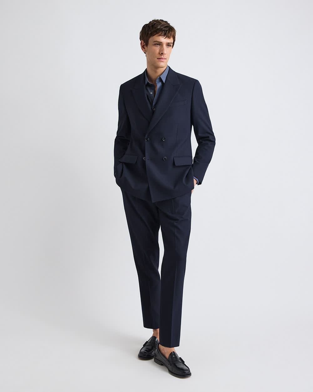 An essential to add to your suiting wardrobe, this elegant navy blazer cut in a comfortable tailored fit is a versatile piece. Wear it with its matching pants or with a pair of chinos or jeans for a more casual style. With its peaked lapel collar, this blazer is sure to provide you with a sophisticated, timeless style. Matching suit pant available.