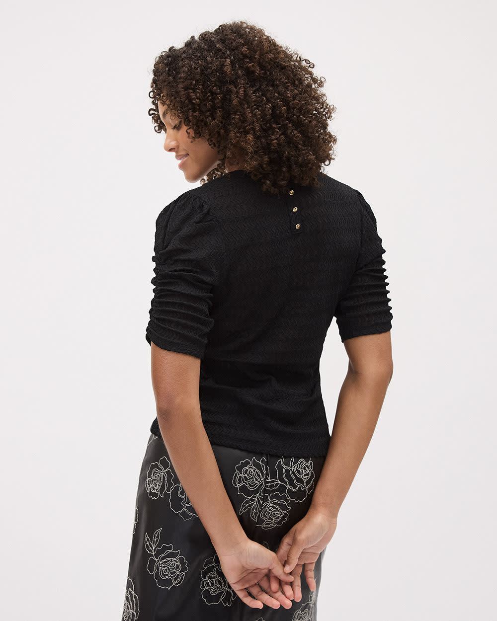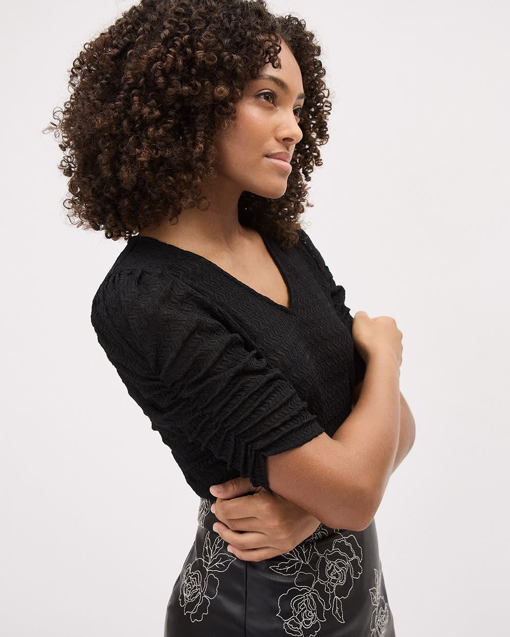 Wear it with a dressy pant, a flowy skirt or your favourite jeans. This V-neck top featuring short puffy sleeves does it all.