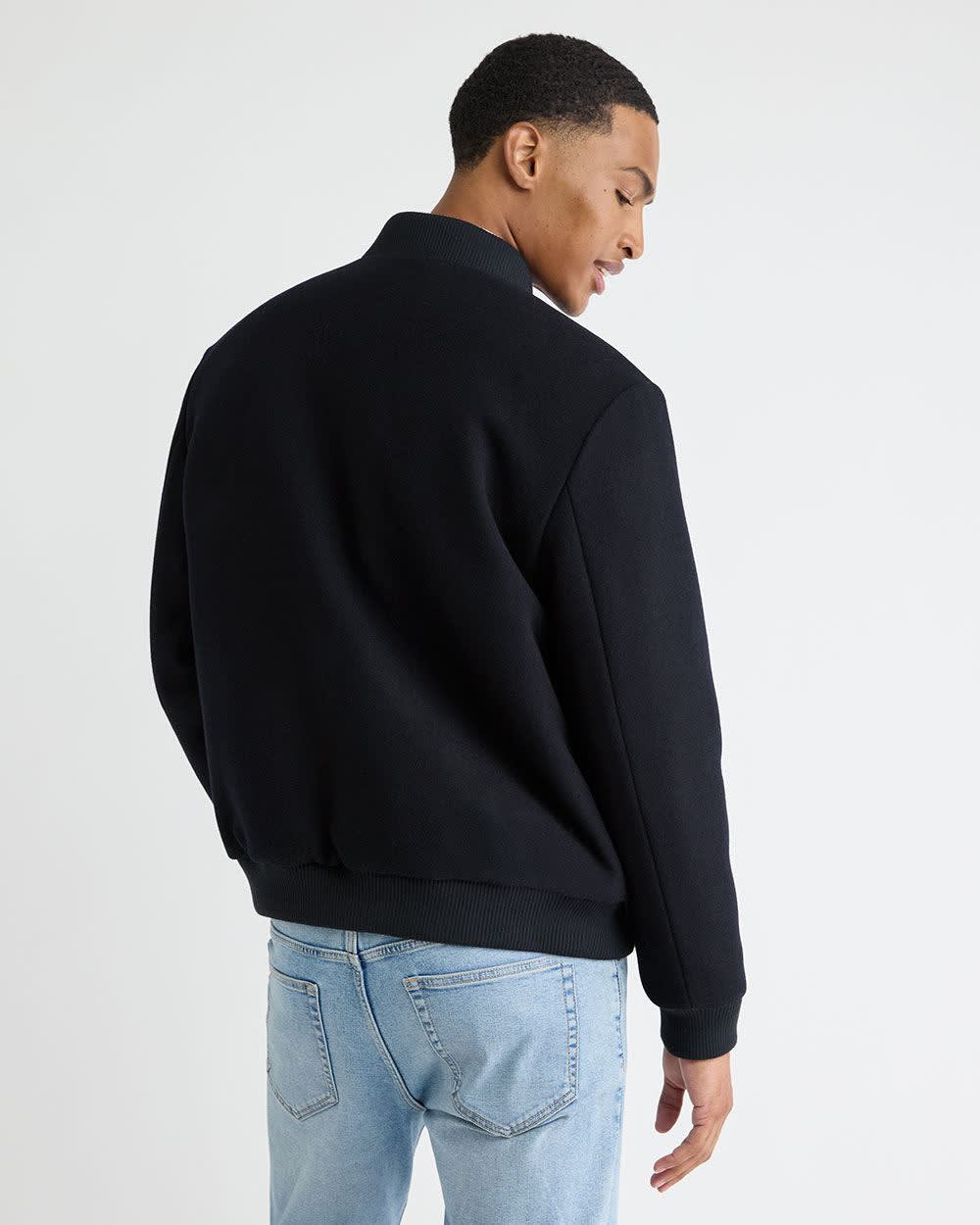 A modern wool-blend bomber jacket that combines warmth, comfort, and timeless style. Perfect for everyday layering.