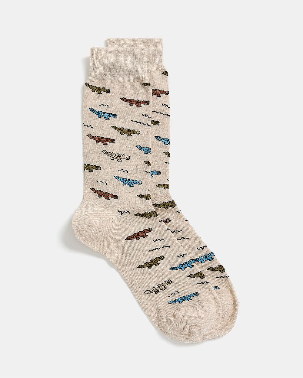 Ajoutez de la personnalité à votre tenue avec ces bas beiges pour hommes en mélange de coton décorés de petits crocodiles colorés.