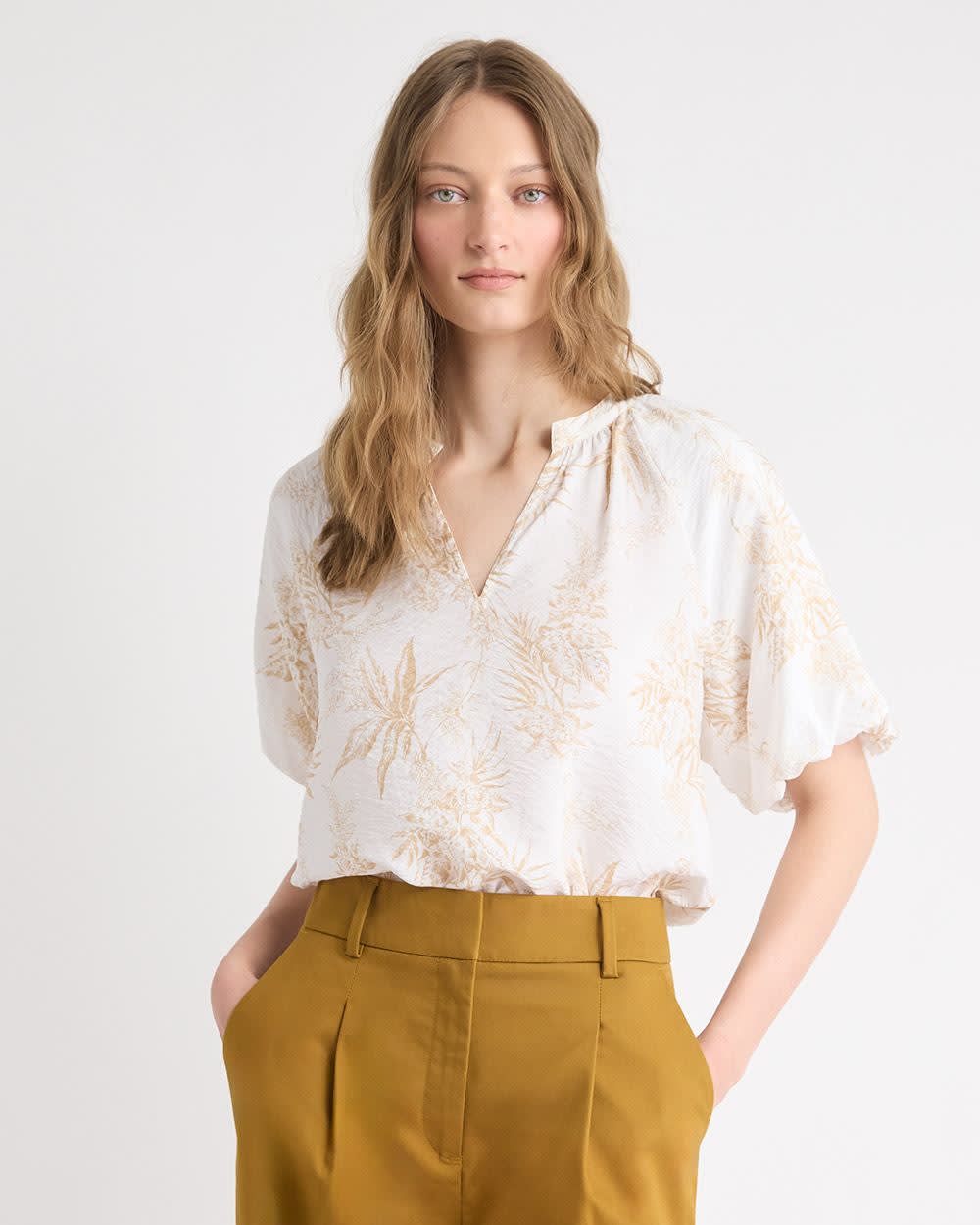 Conçue dans un tissu léger et confortable, cette blouse à manches courtes bouffantes est parfaite à apporter dans votre valise où que vous alliez. Une pièce tendance autant en ville que pour les week-ends au chalet.