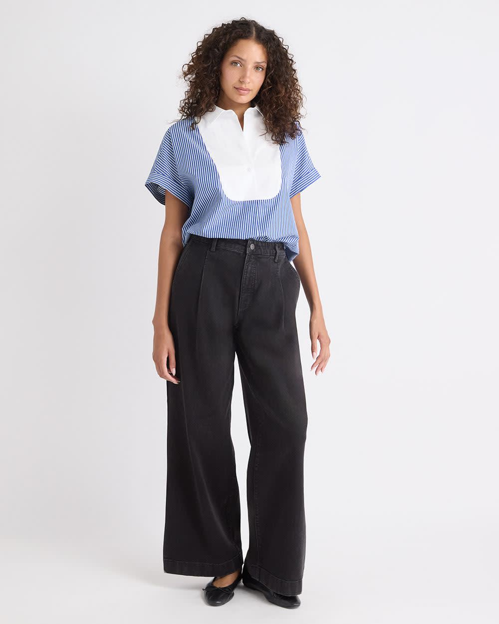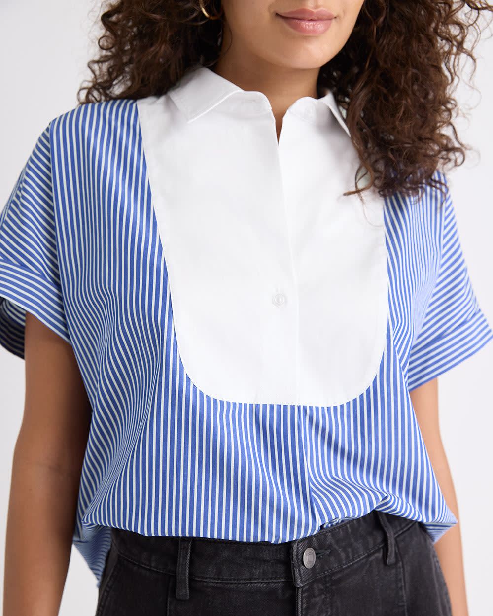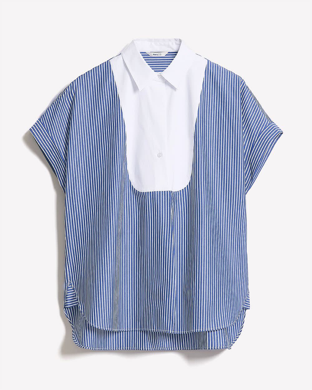 Blouse en Popeline Rayée à Manches Très Courtes et Col Chemisier