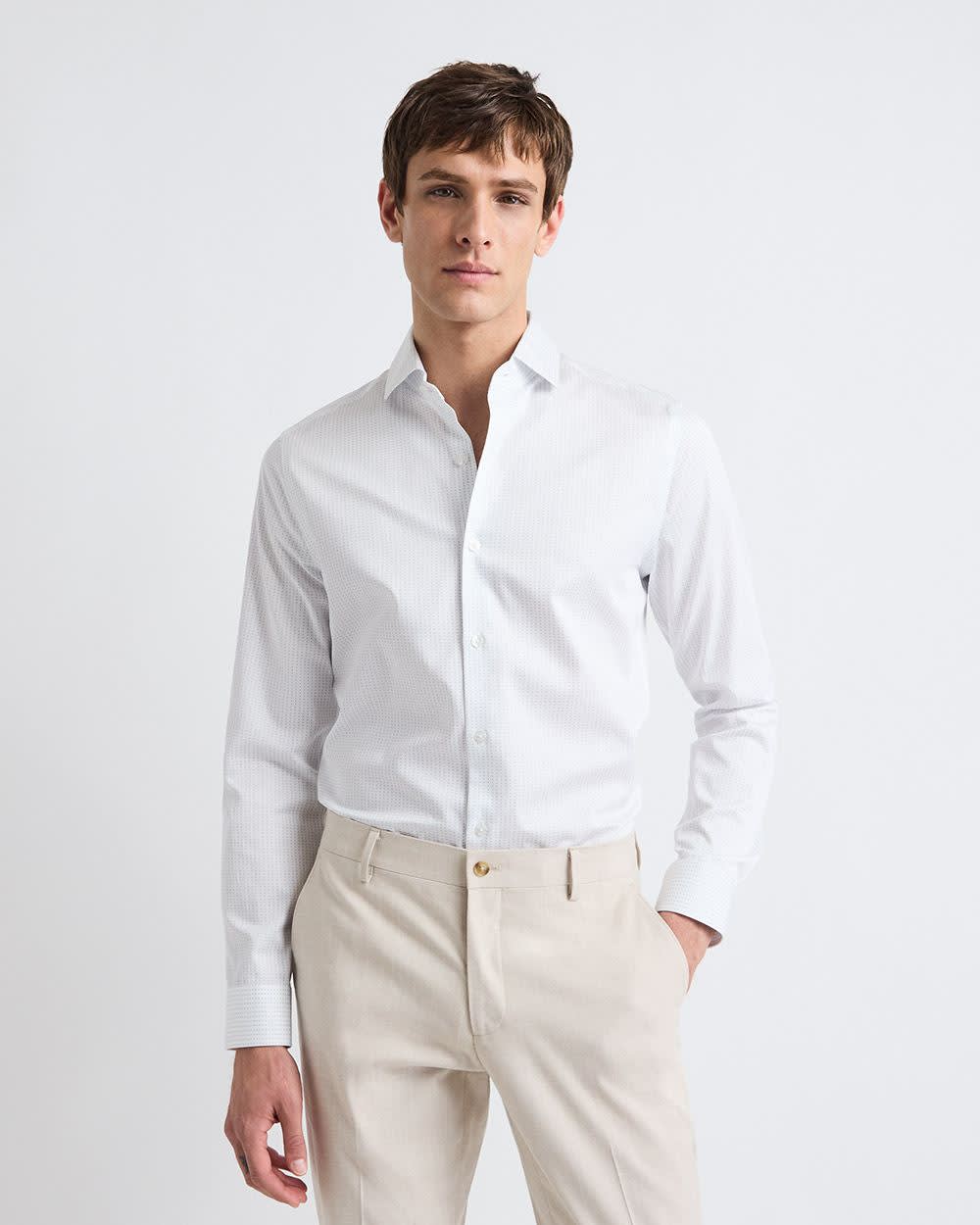 Cette classique chemise blanche à coupe étroite décorée d'un discret motif à pois est une superbe pièce à ajouter à votre garde-robe professionnelle, car elle s'agence à la perfection avec plusieurs pantalons de complet.