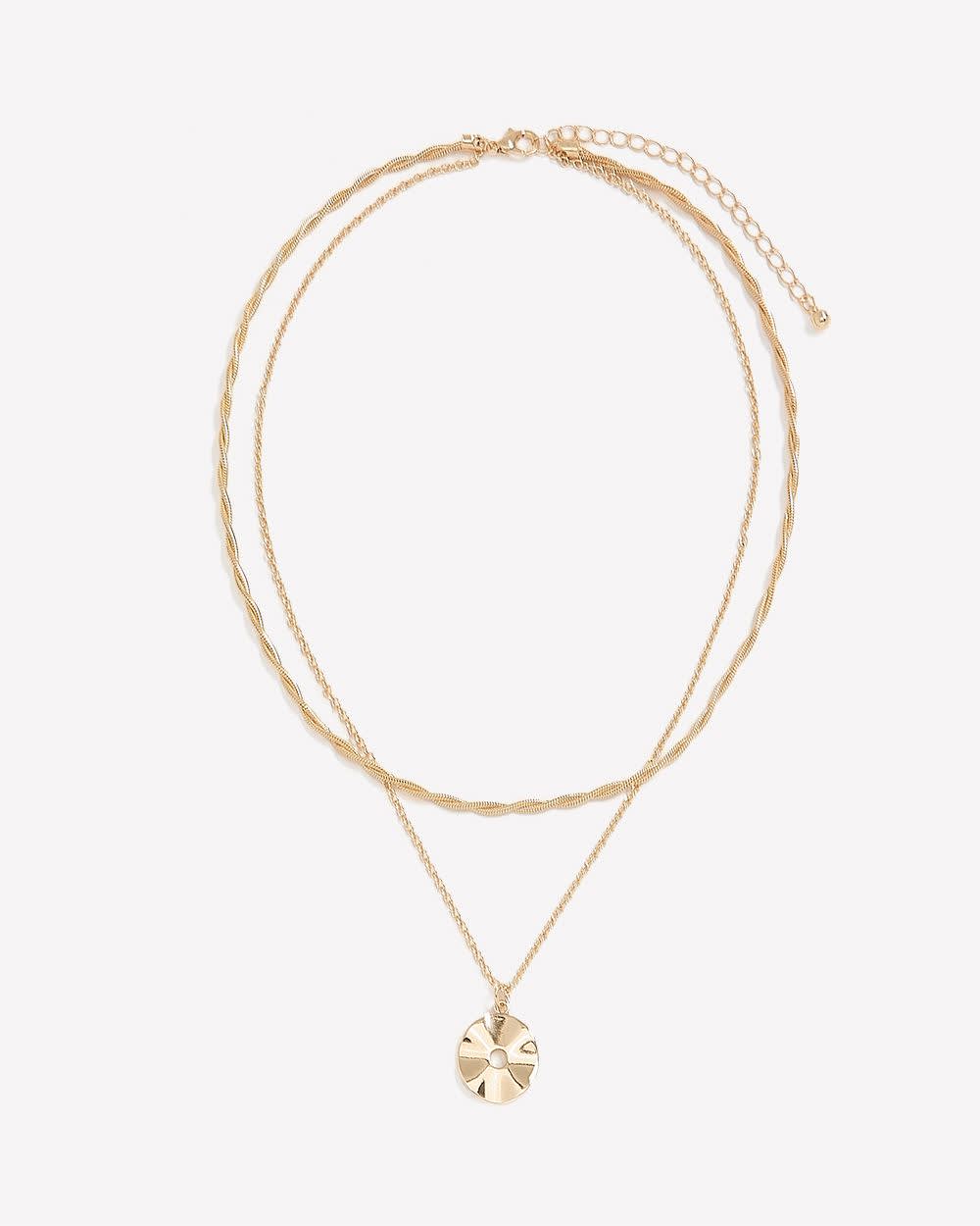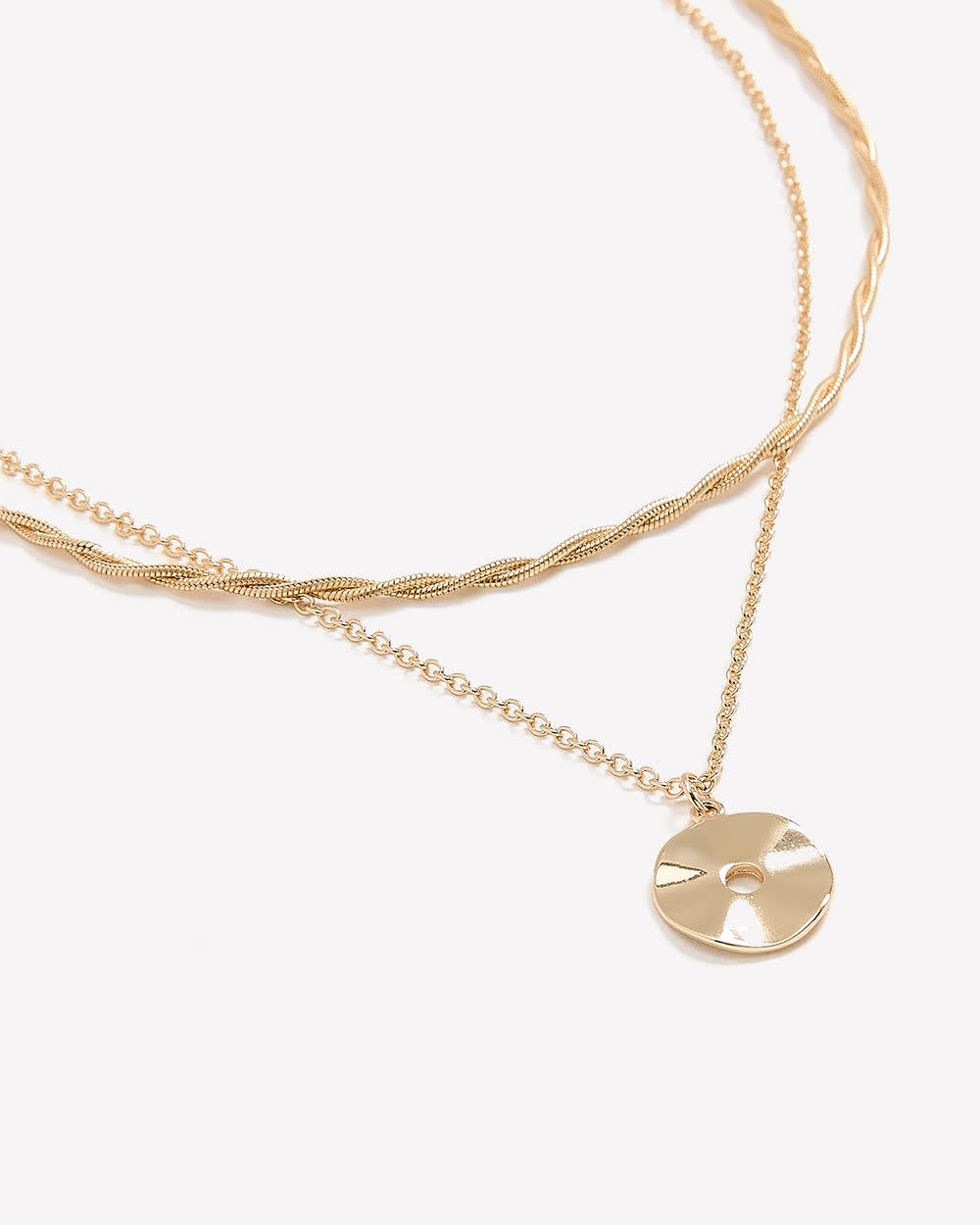 La pièce parfaite pour compléter votre tenue, vous adorerez ce collier doté de deux chaînes, dont l'une est plate avec un pendentif rond en métal et l'autre est torsadée.